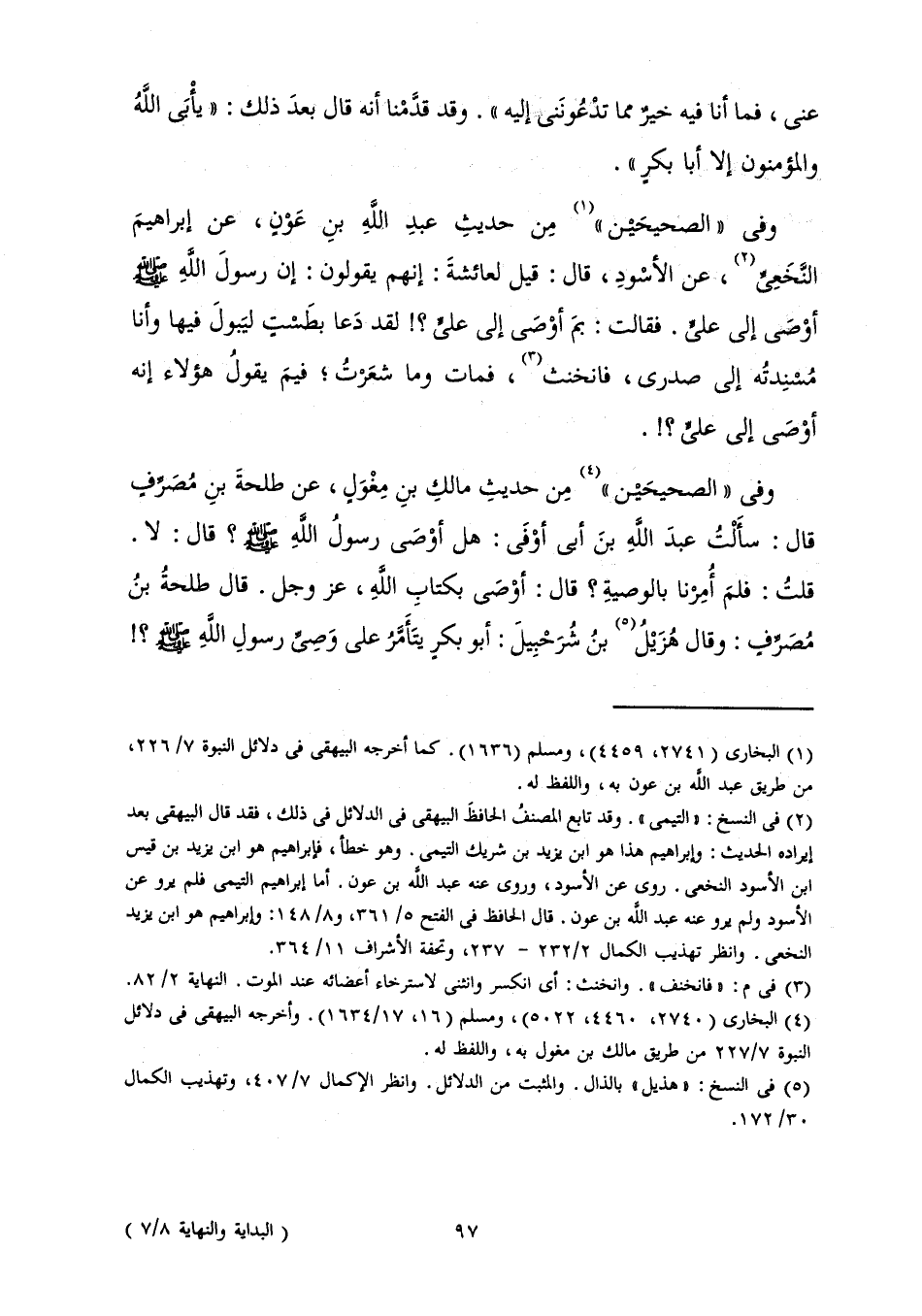 وَفِي " الصَّحِيحَيْنِ " مِنْ حَدِيثِ مَالِكِ بْنِ مِغْوَلٍ، عَنْ طَلْحَةَ بْنِ مُصَرِّفٍ قَالَ: سَأَلْتُ عَبْدَ اللَّهِ بْنَ أَبِي أَوْفَى: هَلْ أَوْصَى رَسُولُ اللَّهِ صَلَّى اللَّهُ عَلَيْهِ وَسَلَّمَ؟ قَالَ: لَا. قُلْتُ: فَلِمَ أُمِرْنَا بِالْوَصِيَّةِ؟ قَالَ: أَوْصَى بِكِتَابِ اللَّهِ، عَزَّ وَجَلَّ. قَالَ طَلْحَةُ بْنُ مُصَرِّفٍ: وَقَالَ هُزَيْلُ بْنُ شُرَحْبِيلَ: أَبُو بَكْرٍ يَتَأَمَّرُ عَلَى وَصِيِّ رَسُولِ اللَّهِ صَلَّى اللَّهُ عَلَيْهِ وَسَلَّمَ؟ !