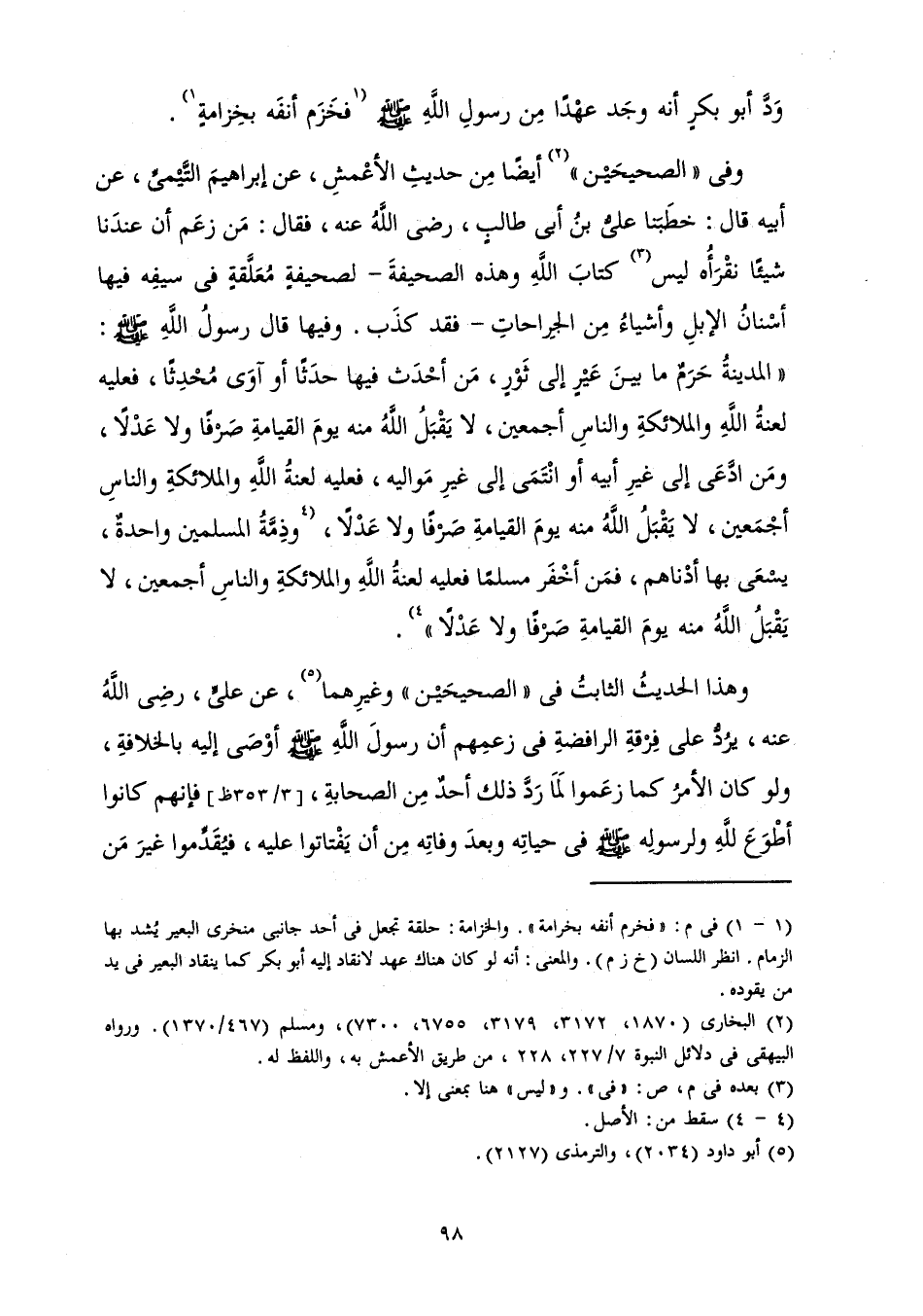 وَفِي " الصَّحِيحَيْنِ " أَيْضًا مِنْ حَدِيثِ الْأَعْمَشِ عَنْ إِبْرَاهِيمَ التَّيْمِيِّ عَنْ أَبِيهِ قَالَ: خَطَبَنَا عَلِيُّ بْنُ أَبِي طَالِبٍ رَضِيَ اللَّهُ عَنْهُ، فَقَالَ مَنْ زَعَمَ أَنَّ عِنْدَنَا شَيْئًا نَقْرَؤُهُ لَيْسَ كِتَابَ اللَّهِ وَهَذِهِ الصَّحِيفَةَ - لِصَحِيفَةٍ مُعَلَّقَةٍ فِي سَيْفِهِ فِيهَا أَسْنَانُ الْإِبِلِ وَأَشْيَاءُ مِنَ الْجِرَاحَاتِ - فَقَدْ كَذَبَ. وَفِيهَا قَالَ رَسُولُ اللَّهِ صَلَّى اللَّهُ عَلَيْهِ وَسَلَّمَ: «الْمَدِينَةُ حَرَمٌ مَا بَيْنَ عَيْرٍ إِلَى ثَوْرٍ، مَنْ أَحْدَثَ فِيهَا حَدَثًا أَوْ آوَى مُحْدِثًا، فَعَلَيْهِ لَعْنَةُ اللَّهِ وَالْمَلَائِكَةِ وَالنَّاسِ أَجْمَعِينَ، لَا يَقْبَلُ اللَّهُ مِنْهُ يَوْمَ الْقِيَامَةِ صَرْفًا وَلَا عَدْلًا، وَمَنِ ادَّعَى إِلَى غَيْرِ أَبِيهِ أَوِ انْتَمَى إِلَى غَيْرِ مَوَالِيهِ، فَعَلَيْهِ لَعْنَةُ اللَّهِ وَالْمَلَائِكَةِ وَالنَّاسِ أَجْمَعِينَ، لَا يَقْبَلُ اللَّهُ مِنْهُ يَوْمَ الْقِيَامَةِ صَرْفًا وَلَا عَدْلًا، وَذِمَّةُ الْمُسْلِمِينَ وَاحِدَةٌ، يَسْعَى بِهَا أَدْنَاهُمْ، فَمَنَّ أَخَفَرَ مُسْلِمًا فَعَلَيْهِ لَعْنَةُ اللَّهِ وَالْمَلَائِكَةِ وَالنَّاسِ أَجْمَعِينَ، لَا يَقْبَلُ اللَّهُ مِنْهُ يَوْمَ الْقِيَامَةِ صَرْفًا وَلَا عَدْلًا» .
