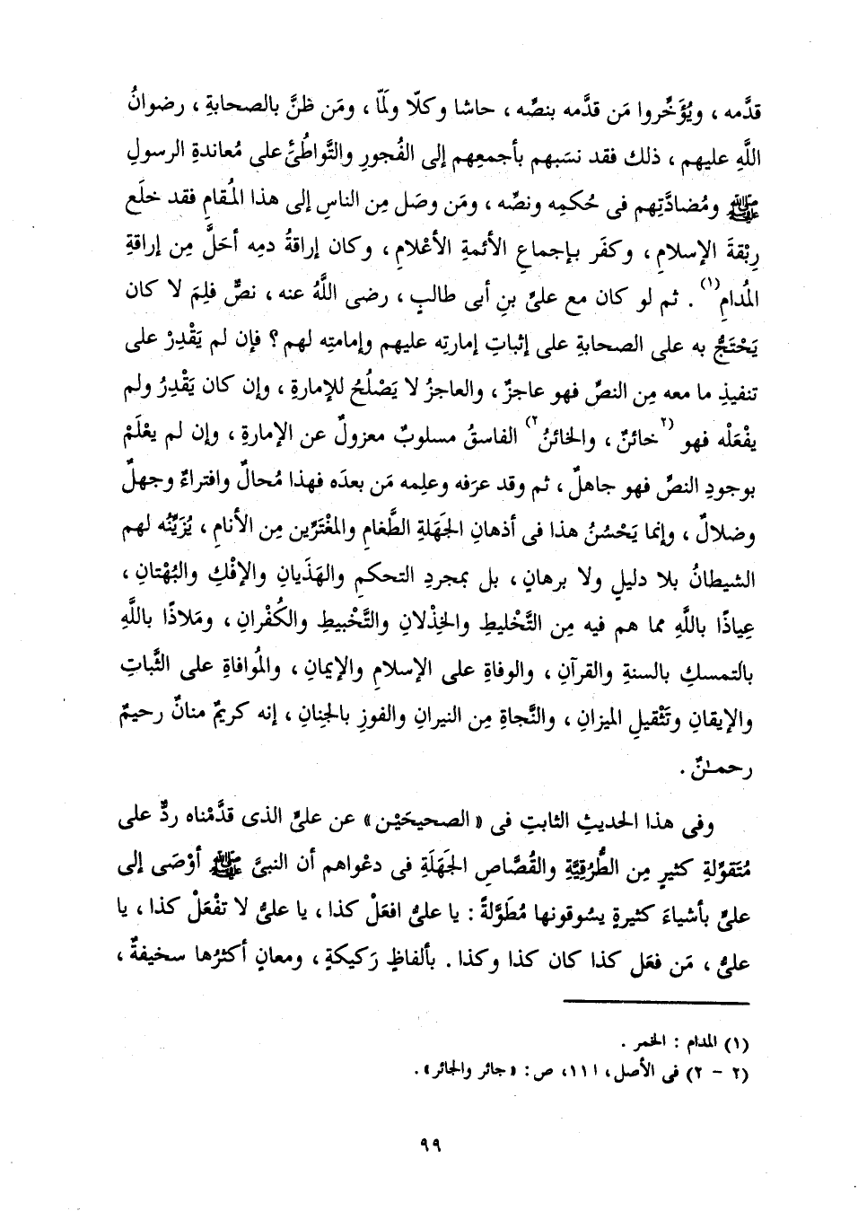 قَدَّمَهُ، وَيُؤَخِّرُوا مَنْ قَدَّمَهُ بِنَصِّهِ، حَاشَا وَكَلَّا وَلَمَّا، وَمَنْ ظَنَّ بِالصَّحَابَةِ، رِضْوَانُ اللَّهِ عَلَيْهِمْ ذَلِكَ فَقَدْ نَسَبَهُمْ بِأَجْمَعِهِمْ إِلَى الْفُجُورِ وَالتَّوَاطِئِ عَلَى مُعَانَدَةِ الرَّسُولِ صَلَّى اللَّهُ عَلَيْهِ وَسَلَّمَ وَمُضَادَّتِهِمْ فِي حُكْمِهِ وَنَصِّهِ، وَمَنْ وَصَلَ مِنَ النَّاسِ إِلَى هَذَا الْمَقَامِ فَقَدْ خَلَعَ رِبْقَةَ الْإِسْلَامِ، وَكَفَرَ بِإِجْمَاعِ الْأَئِمَّةِ الْأَعْلَامِ، وَكَانَ إِرَاقَةُ دَمِهِ أَحَلَّ مِنْ إِرَاقَةِ الْمُدَامِ. ثُمَّ لَوْ كَانَ مَعَ عَلِيِّ بْنِ أَبِي طَالِبٍ رَضِيَ اللَّهُ عَنْهُ، نَصٌّ فَلِمَ لَا كَانَ يَحْتَجُّ بِهِ عَلَى الصَّحَابَةِ عَلَى إِثْبَاتِ إِمَارَتِهِ عَلَيْهِمْ وَإِمَامَتِهِ لَهُمْ؟ فَإِنْ لَمْ يَقْدِرْ عَلَى تَنْفِيذِ مَا مَعَهُ مِنَ النَّصِّ فَهُوَ عَاجِزٌ، وَالْعَاجِزُ لَا يَصْلُحُ لِلْإِمَارَةِ، وَإِنْ كَانَ يَقْدِرُ وَلَمْ يَفْعَلْهُ فَهُوَ خَائِنٌ، وَالْخَائِنُ الْفَاسِقُ مَسْلُوبٌ مَعْزُولٌ عَنِ الْإِمَارَةِ، وَإِنْ لَمْ يَعْلَمْ بِوُجُودِ النَّصِّ فَهُوَ جَاهِلٌ، ثُمَّ وَقَدْ عَرَفَهُ وَعَلِمَهُ مَنْ بَعْدَهُ فَهَذَا مُحَالٌ وَافْتِرَاءٌ وَجَهْلٌ وَضَلَالٌ، وَإِنَّمَا يَحْسُنُ هَذَا فِي أَذْهَانِ الْجَهَلَةِ الطَّغَامِ وَالْمُغْتَرِّينَ مِنَ الْأَنَامِ، يُزَيِّنُهُ لَهُمُ الشَّيْطَانُ بِلَا دَلِيلٍ وَلَا بُرْهَانٍ، بَلْ بِمُجَرَّدِ التَّحَكُّمِ وَالْهَذَيَانِ وَالْإِفْكِ وَالْبُهْتَانِ عِيَاذًا بِاللَّهِ مِمَّا هُمْ فِيهِ مِنَ التَّخْلِيطِ وَالْخِذْلَانِ وَالتَّخْبِيطِ وَالْكُفْرَانِ، وَمَلَاذًا بِاللَّهِ بِالتَّمَسُّكِ بِالسُّنَّةِ وَالْقُرْآنِ، وَالْوَفَاةِ عَلَى الْإِسْلَامِ وَالْإِيمَانِ، وَالْمُوَافَاةِ عَلَى الثَّبَاتِ وَالْإِيقَانِ وَتَثْقِيلِ الْمِيزَانِ، وَالنَّجَاةِ مِنَ النِّيرَانِ وَالْفَوْزِ بِالْجِنَانِ، إِنَّهُ كَرِيمٌ مَنَّانٌ رَحِيمٌ رَحْمَنٌ.