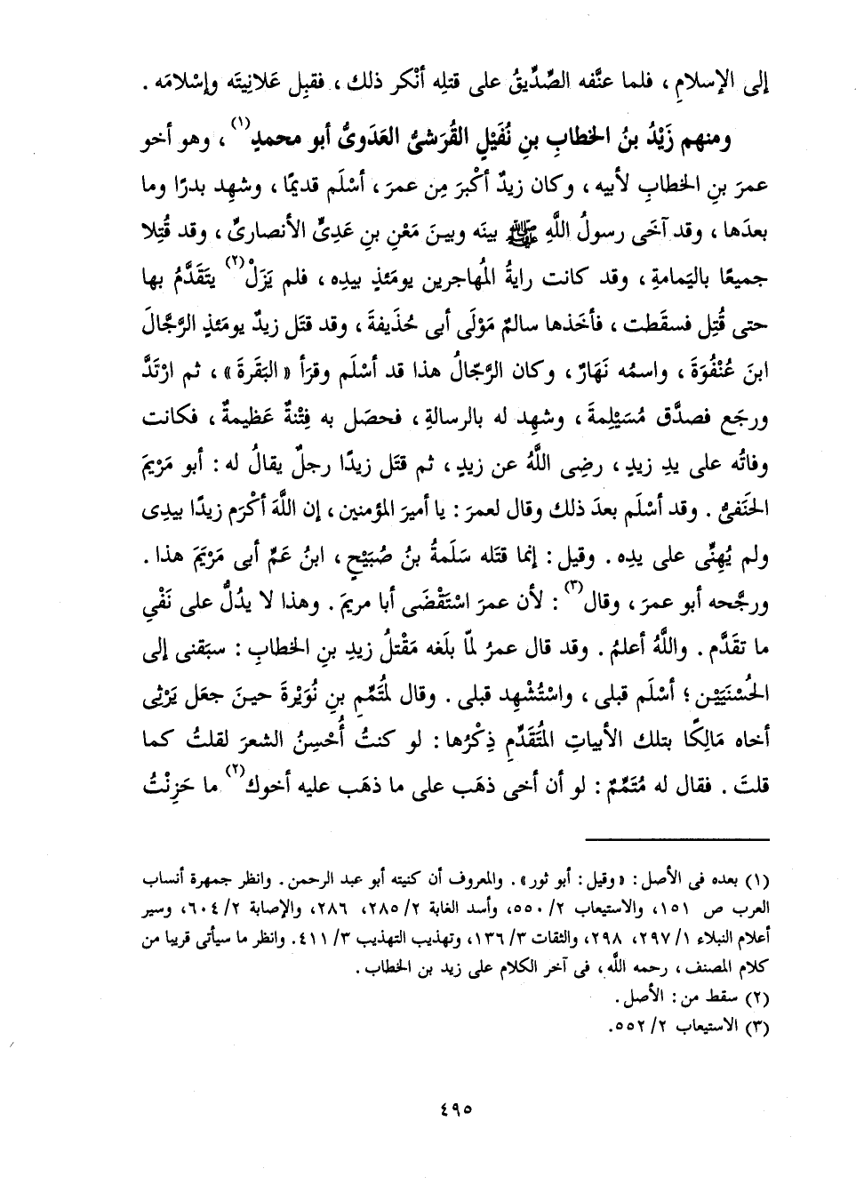 وَمِنْهُمْ زَيْدُ بْنُ الْخَطَّابِ بْنِ نُفَيْلٍ الْقُرَشِيُّ الْعَدَوِيُّ أَبُو مُحَمَّدٍ، وَهُوَ أَخُو عُمَرَ بْنِ الْخَطَّابِ لِأَبِيهِ، وَكَانَ زَيْدٌ أَكْبَرُ مِنْ عُمَرَ، أَسْلَمَ قَدِيمًا، وَشَهِدَ بَدْرًا وَمَا بَعْدَهَا، وَقَدْ آخَى رَسُولُ اللَّهِ صَلَّى اللَّهُ عَلَيْهِ وَسَلَّمَ بَيْنَهُ وَبَيْنَ مَعْنِ بْنِ عَدِيٍّ الْأَنْصَارِيِّ، وَقَدْ قُتِلَا جَمِيعًا بِالْيَمَامَةِ، وَقَدْ كَانَتْ رَايَةُ الْمُهَاجِرِينَ يَوْمَئِذٍ بِيَدِهِ، فَلَمْ يَزَلْ يَتَقَدَّمُ بِهَا حَتَّى قُتِلَ فَسَقَطَتْ، فَأَخَذَهَا سَالِمٌ مَوْلَى أَبِي حُذَيْفَةَ، وَقَدْ قَتَلَ زَيْدٌ يَوْمَئِذٍ الرَّجَّالَ بْنَ عُنْفُوَةَ، وَاسْمُهُ نَهَارٌ، وَكَانَ الرَّجَّالُ هَذَا قَدْ أَسْلَمَ وَقَرَأَ " الْبَقَرَةَ " ثُمَّ ارْتَدَّ وَرَجَعَ فَصَدَّقَ مُسَيْلِمَةَ، وَشَهِدَ لَهُ بِالرِّسَالَةِ، فَحَصَلَ بِهِ فِتْنَةٌ عَظِيمَةٌ، فَكَانَتْ وَفَاتُهُ عَلَى يَدِ زَيْدٍ، رَضِيَ اللَّهُ عَنْ زَيْدٍ، ثُمَّ قَتَلَ زَيْدًا رَجُلٌ يُقَالُ لَهُ: أَبُو مَرْيَمَ الْحَنَفِيُّ. وَقَدْ أَسْلَمَ بَعْدَ ذَلِكَ، وَقَالَ لِعُمَرَ: يَا أَمِيرَ الْمُؤْمِنِينَ، إِنَّ اللَّهَ أَكْرَمَ زَيْدًا بِيَدِي وَلَمْ يُهِنِّي عَلَى يَدِهِ. وَقِيلَ: إِنَّمَا قَتَلَهُ سَلَمَةُ بْنُ صُبَيْحٍ، ابْنُ عَمِّ أَبِي مَرْيَمَ هَذَا. وَرَجَّحَهُ أَبُو عُمَرَ، وَقَالَ: لِأَنَّ عُمَرَ اسْتَقْضَى أَبَا مَرْيَمَ، وَهَذَا لَا يَدُلُّ عَلَى نَفْيِ مَا تَقَدَّمَ. وَاللَّهُ أَعْلَمُ. وَقَدْ قَالَ عُمَرُ لَمَّا بَلَغَهُ مَقْتَلُ زَيْدِ بْنِ الْخَطَّابِ سَبَقَنِي إِلَى الْحُسْنَيَيْنِ ; أَسْلَمَ قَبْلِي، وَاسْتُشْهِدَ قَبْلِي. وَقَالَ لِمُتَمِّمِ بْنِ نُوَيْرَةَ حِينَ جَعَلَ يَرْثِي أَخَاهُ مَالِكًا بِتِلْكَ الْأَبْيَاتِ الْمُتَقَدِّمِ ذِكْرُهَا: لَوْ كُنْتُ أُحْسِنُ الشِّعْرَ لَقُلْتُ كَمَا قُلْتَ. فَقَالَ لَهُ مُتَمِّمٌ: لَوْ أَنَّ أَخِي ذَهَبَ عَلَى مَا ذَهَبَ عَلَيْهِ أَخُوكَ مَا حَزِنْتُ