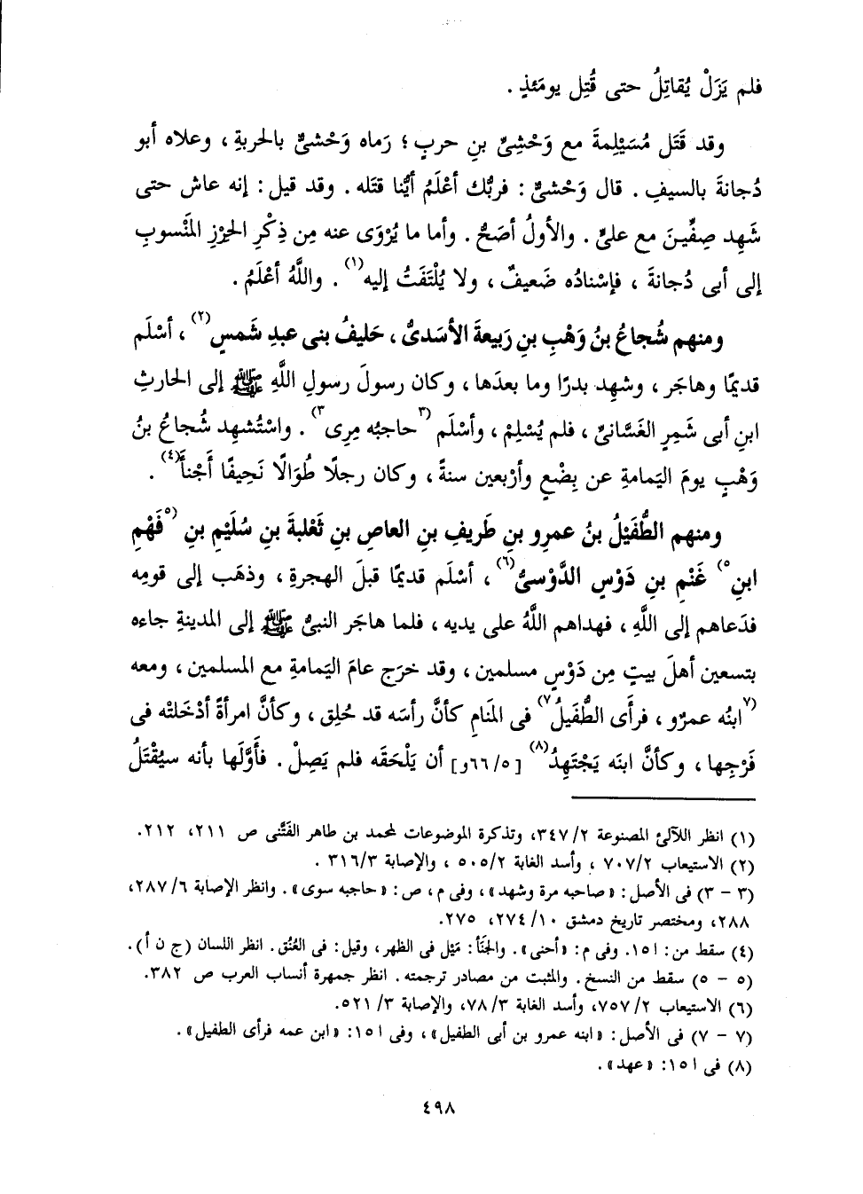 وَمِنْهُمُ الطُّفَيْلُ بْنُ عَمْرِو بْنِ طَرِيفِ بْنِ الْعَاصِ بْنِ ثَعْلَبَةَ بْنِ سُلَيْمِ بْنِ فَهْمِ بْنِ غَنْمِ بْنِ دَوْسٍ الدَّوْسِيُّ أَسْلَمَ قَدِيمًا قَبْلَ الْهِجْرَةِ، وَذَهَبَ إِلَى قَوْمِهِ فَدَعَاهُمْ إِلَى اللَّهِ فَهَدَاهُمُ اللَّهُ عَلَى يَدَيْهِ، فَلَمَّا هَاجَرَ النَّبِيُّ صَلَّى اللَّهُ عَلَيْهِ وَسَلَّمَ إِلَى الْمَدِينَةِ جَاءَهُ بِتِسْعِينَ أَهْلَ بَيْتٍ مِنْ دَوْسٍ مُسْلِمِينَ، وَقَدْ خَرَجَ عَامَ الْيَمَامَةِ مَعَ الْمُسْلِمِينَ، وَمَعَهُ ابْنُهُ عَمْرٌو، فَرَأَى الطُّفَيْلُ فِي الْمَنَامِ كَأَنَّ رَأْسَهُ قَدْ حُلِقَ، وَكَأَنَّ امْرَأَةً أَدْخَلَتْهُ فِي فَرْجِهَا، وَكَأَنَّ ابْنَهُ يَجْتَهِدُ أَنْ يَلْحَقَهُ فَلَمْ يَصِلْ. فَأَوَّلَهَا بِأَنَّهُ سَيُقْتَلُ