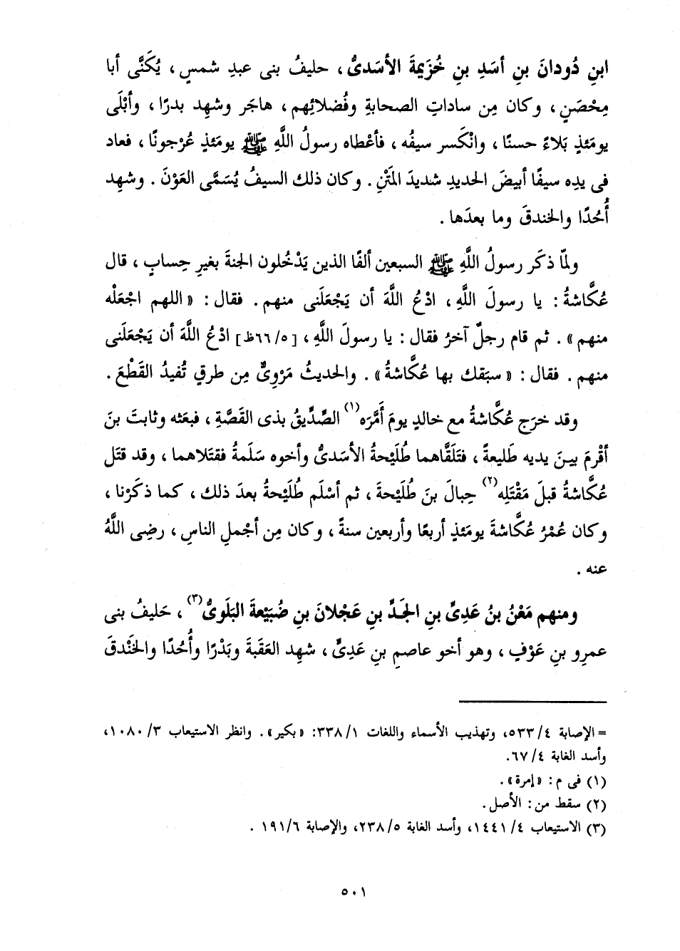 «وَلَمَّا ذَكَرَ رَسُولُ اللَّهِ صَلَّى اللَّهُ عَلَيْهِ وَسَلَّمَ السَّبْعِينَ أَلْفًا الَّذِينَ يَدْخُلُونَ الْجَنَّةَ بِغَيْرِ حِسَابٍ، قَالَ عُكَّاشَةُ: يَا رَسُولَ اللَّهِ، ادْعُ اللَّهَ أَنْ يَجْعَلَنِي مِنْهُمْ. فَقَالَ: " اللَّهُمَّ اجْعَلْهُ مِنْهُمْ ". ثُمَّ قَامَ رَجُلٌ آخَرُ فَقَالَ: يَا رَسُولَ اللَّهِ، ادْعُ اللَّهَ أَنْ يَجْعَلَنِي مِنْهُمْ. فَقَالَ: " سَبَقَكَ بِهَا عُكَّاشَةُ» . وَالْحَدِيثُ مَرْوِّيٌّ مِنْ طُرُقٍ تُفِيدُ الْقَطْعَ.