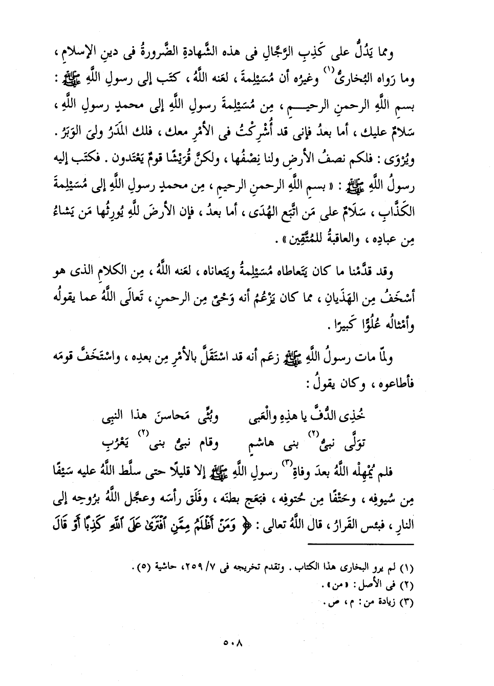 وَمِمَّا يَدُلُّ عَلَى كَذِبِ الرَّجَّالِ فِي هَذِهِ الشَّهَادَةِ الضَّرُورَةُ فِي دِينِ الْإِسْلَامِ، وَمَا رَوَاهُ الْبُخَارِيُّ وَغَيْرُهُ أَنَّ مُسَيْلِمَةَ، لَعَنَهُ اللَّهُ، كَتَبَ إِلَى رَسُولِ اللَّهِ صَلَّى اللَّهُ عَلَيْهِ وَسَلَّمَ: بِسْمِ اللَّهِ الرَّحْمَنِ الرَّحِيمِ، مِنْ مُسَيْلِمَةَ رَسُولُ اللَّهِ إِلَى مُحَمَّدٍ رَسُولُ اللَّهِ، سَلَامٌ عَلَيْكَ، أَمَّا بَعْدُ، فَإِنِّي قَدْ أُشْرِكْتُ فِي الْأَمْرِ مَعَكَ، فَلَكَ الْمَدَرُ وَلِيَ الْوَبَرُ. وَيُرْوَى: فَلَكُمْ نِصْفُ الْأَرْضِ وَلَنَا نِصْفُهَا، وَلَكِنَّ قُرَيْشًا قَوْمٌ يَعْتَدُونَ. فَكَتَبَ إِلَيْهِ رَسُولُ اللَّهِ صَلَّى اللَّهُ عَلَيْهِ وَسَلَّمَ: «بِسْمِ اللَّهِ الرَّحْمَنِ الرَّحِيمِ، مِنْ مُحَمَّدٍ رَسُولُ اللَّهِ إِلَى مُسَيْلِمَةَ الْكَذَّابِ، سَلَامٌ عَلَى مَنِ اتَّبَعَ الْهُدَى، أَمَّا بَعْدُ، فَإِنَّ الْأَرْضَ لِلَّهِ يُورِثُهَا مَنْ يَشَاءُ مِنْ عِبَادِهِ، وَالْعَاقِبَةُ لِلْمُتَّقِينَ» .