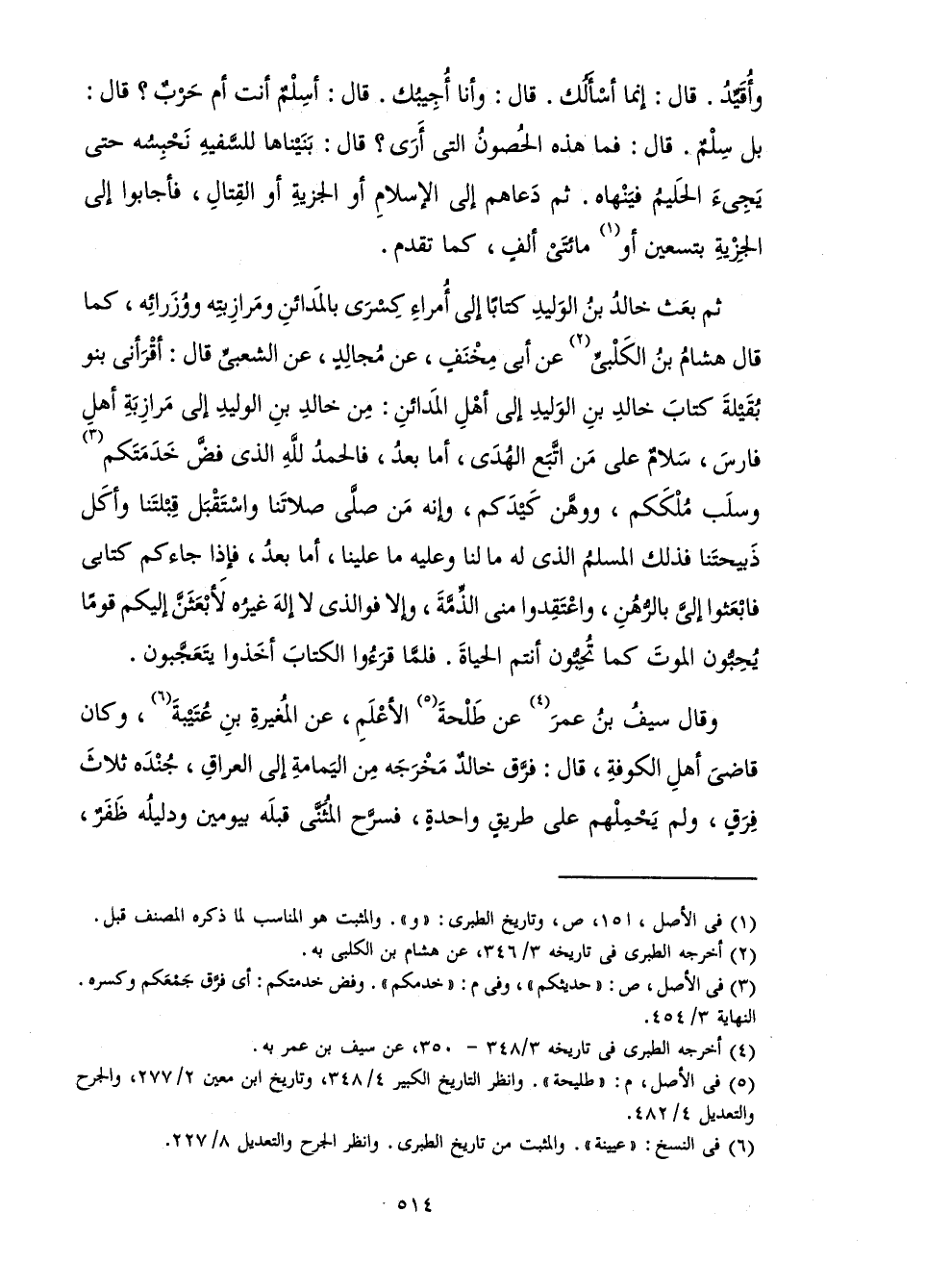 ثُمَّ بَعَثَ خَالِدُ بْنُ الْوَلِيدِ كِتَابًا إِلَى أُمَرَاءِ كِسْرَى بِالْمَدَائِنِ وَمَرَازِبَتِهِ وَوُزَرَائِهِ، كَمَا قَالَ هِشَامُ بْنُ الْكَلْبِيِّ عَنْ أَبِي مِخْنَفٍ، عَنْ مَجَالِدٍ، عَنِ الشَّعْبِيِّ قَالَ: أَقْرَأَنِي بَنُو بُقَيْلَةَ كِتَابَ خَالِدِ بْنِ الْوَلِيدِ إِلَى أَهْلِ الْمَدَائِنِ: مِنْ خَالِدِ بْنِ الْوَلِيدِ إِلَى مَرَازِبَةِ أَهْلِ فَارِسَ، سَلَامٌ عَلَى مَنِ اتَّبَعَ الْهُدَى، أَمَّا بَعْدُ، فَالْحَمْدُ لِلَّهِ الَّذِي فَضَّ خَدَمَتَكُمْ وَسَلَبَ مُلْكَكُمْ، وَوَهَّنَ كَيْدَكُمْ، وَإِنَّهُ مَنْ صَلَّى صَلَاتَنَا وَاسْتَقْبَلَ قِبْلَتَنَا وَأَكَلَ ذَبِيحَتَنَا فَذَلِكَ الْمُسْلِمُ الَّذِي لَهُ مَا لَنَا وَعَلَيْهِ مَا عَلَيْنَا، أَمَّا بَعْدُ، فَإِذَا جَاءَكُمْ كِتَابِي فَابْعَثُوا إِلَيَّ بِالرُّهُنِ، وَاعْتَقِدُوا مِنِّي الذِّمَّةَ، وَإِلَّا فَوَالَّذِي لَا إِلَهَ غَيْرُهُ لَأَبْعَثَنَّ إِلَيْكُمْ قَوْمًا يُحِبُّونَ الْمَوْتَ كَمَا تُحِبُّونَ أَنْتُمُ الْحَيَاةَ. فَلَمَّا قَرَأُوا الْكِتَابَ أَخَذُوا يَتَعَجَّبُونَ.