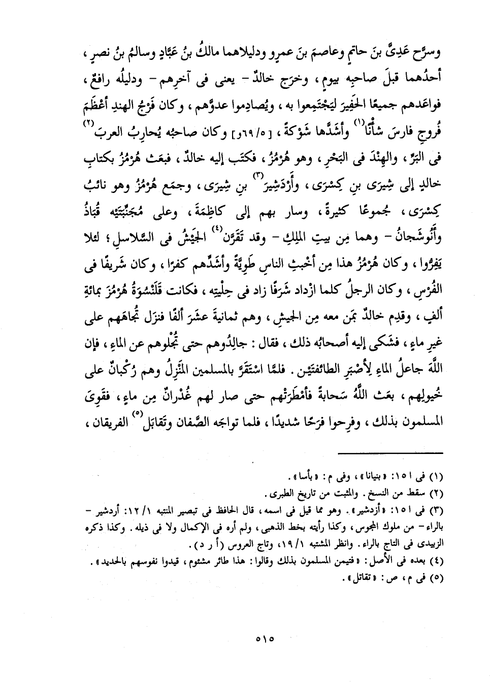 وَسَرَّحَ عَدِيَّ بْنَ حَاتِمٍ وَعَاصِمَ بْنَ عَمْرٍو وَدَلِيلَاهُمَا مَالِكُ بْنُ عَبَّادٍ وَسَالِمُ بْنُ نَصْرٍ، أَحَدُهُمَا قَبْلَ صَاحِبِهِ بِيَوْمٍ، وَخَرَجَ خَالِدٌ - يَعْنِي فِي آخِرِهِمْ - وَدَلِيلُهُ رَافِعٌ، فَوَاعَدَهُمْ جَمِيعًا الْحَفِيرَ لِيَجْتَمِعُوا بِهِ، وَيُصَادِمُوا عَدُوَّهُمْ، وَكَانَ فَرْجُ الْهِنْدِ أَعْظَمَ فُرُوجِ فَارِسَ شَأْنًا وَأَشَدَّهَا شَوْكَةً، وَكَانَ صَاحِبُهُ يُحَارِبُ الْعَرَبَ فِي الْبَرِّ، وَالْهِنْدَ فِي الْبَحْرِ، وَهُوَ هُرْمُزُ، فَكَتَبَ إِلَيْهِ خَالِدٌ، فَبَعَثَ هُرْمُزُ بِكِتَابِ خَالِدٍ إِلَى شِيرَى بْنِ كِسْرَى، وَأَرْدَشِيرَ بْنِ شِيرَى، وَجَمَعَ هُرْمُزُ وَهُوَ نَائِبُ كِسْرَى، جُمُوعًا كَثِيرَةً، وَسَارَ بِهِمْ إِلَى كَاظِمَةَ، وَعَلَى مُجَنِّبَتَيْهِ قُبَاذُ وَأَنُوشَجَانُ - وَهُمَا مِنْ بَيْتِ الْمَلِكِ - وَقَدْ تَقَرَّنَ الْجَيْشُ فِي السَّلَاسِلِ ; لِئَلَّا يَفِرُّوا، وَكَانَ هُرْمُزُ هَذَا مِنْ أَخْبَثِ النَّاسِ طَوِيَّةً وَأَشَدِّهِمْ كُفْرًا، وَكَانَ شَرِيفًا فِي الْفُرْسِ، وَكَانَ الرَّجُلُ كُلَّمَا ازْدَادَ شَرَفًا زَادَ فِي حِلْيَتِهِ، فَكَانَتْ قَلَنْسُوَةُ هُرْمُزَ بِمِائَةِ أَلْفٍ، وَقَدِمَ خَالِدٌ وَمَنْ مَعَهُ مِنَ الْجَيْشِ، وَهُمْ ثَمَانِيَةَ عَشَرَ أَلْفًا فَنَزَلَ تُجَاهَهُمْ عَلَى غَيْرِ مَاءٍ، فَشَكَى إِلَيْهِ أَصْحَابُهُ ذَلِكَ، فَقَالَ: جَالِدُوهُمْ حَتَّى تُجْلُوهُمْ عَنِ الْمَاءِ، فَإِنَّ اللَّهَ جَاعِلُ الْمَاءِ لِأَصْبَرِ الطَّائِفَتَيْنِ. فَلَمَّا اسْتَقَرَّ بِالْمُسْلِمِينَ الْمَنْزِلُ وَهُمْ رُكْبَانٌ عَلَى خُيُولِهِمْ، بَعَثَ اللَّهُ سَحَابَةً فَأَمْطَرَتْهُمْ حَتَّى صَارَ لَهُمْ غُدْرَانٌ مِنْ مَاءٍ، فَقَوِيَ الْمُسْلِمُونَ بِذَلِكَ، وَفَرِحُوا فَرَحًا شَدِيدًا، فَلَمَّا تَوَاجَهَ الصَّفَّانِ وَتَقَابَلَ الْفَرِيقَانِ،