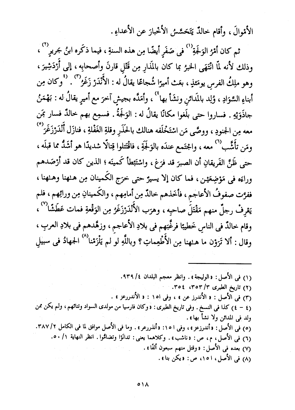 ثُمَّ كَانَ أَمْرُ الْوَلَجَةِ فِي صَفَرٍ أَيْضًا مِنْ هَذِهِ السَّنَةِ، فِيمَا ذَكَرَهُ ابْنُ جَرِيرٍ، وَذَلِكَ لِأَنَّهُ لَمَّا انْتَهَى الْخَبَرُ بِمَا كَانَ بِالْمَذَارِ مِنْ قَتْلِ قَارَنَ وَأَصْحَابِهِ، إِلَى أَرْدَشِيرَ، وَهُوَ مَلِكُ الْفُرْسِ يَوْمَئِذٍ، بَعَثَ أَمِيرًا شُجَاعًا يُقَالُ لَهُ: الْأَنْدَرْزَغَرُ. وَكَانَ مِنْ أَبْنَاءِ السَّوَادِ، وُلِدَ بِالْمَدَائِنِ وَنَشَأَ بِهَا، وَأَمَدَّهُ بِجَيْشٍ آخَرَ مَعَ أَمِيرٍ يُقَالُ لَهُ: بَهْمَنُ جَاذَوَيْهِ. فَسَارُوا حَتَّى بَلَغُوا مَكَانًا يُقَالُ لَهُ: الْوَلَجَةُ. فَسَمِعَ بِهِمْ خَالِدٌ فَسَارَ بِمَنْ مَعَهُ مِنَ الْجُنُودِ، وَوَصَّى مَنِ اسْتَخْلَفَهُ هُنَالِكَ بِالْحَذَرِ وَقِلَّةِ الْغَفْلَةِ، فَنَازَلَ أَنْدَرْزَغَرَ وَمَنْ تَأَشَّبَ مَعَهُ، وَاجْتَمَعَ عِنْدَهُ بِالْوَلَجَةِ، فَاقْتَتَلُوا قِتَالًا شَدِيدًا هُوَ أَشَدُّ مِمَّا قَبْلَهُ، حَتَّى ظَنَّ الْفَرِيقَانِ أَنَّ الصَّبْرَ قَدْ فَرَغَ، وَاسْتَبْطَأَ كَمِينَهُ ; الَّذِي كَانَ قَدْ أَرْصَدَهُمْ وَرَاءَهُ فِي مَوْضِعَيْنِ، فَمَا كَانَ إِلَّا يَسِيرٌ حَتَّى خَرَجَ الْكَمِينَانِ مِنْ هَا هُنَا وَهَا هُنَا، فَفَرَّتْ صُفُوفُ الْأَعَاجِمِ، فَأَخَذَهُمْ خَالِدٌ مِنْ أَمَامِهِمْ، وَالْكَمِينَانِ مِنْ وَرَائِهِمْ، فَلَمْ يَعْرِفْ رَجُلٌ مِنْهُمْ مَقْتَلَ صَاحَبِهِ، وَهَرَبَ الْأَنْدَرْزَغَرُ مِنَ الْوَقْعَةِ فَمَاتَ عَطَشًا، وَقَامَ خَالِدٌ فِي النَّاسِ خَطِيبًا فَرَغَّبَهُمْ فِي بِلَادِ الْأَعَاجِمِ، وَزَهَّدَهُمْ فِي بِلَادِ الْعَرَبِ، وَقَالَ: أَلَا تَرَوْنَ مَا هَا هُنَا مِنَ الْأَطْعِمَاتِ؟ وَبِاللَّهِ لَوْ لَمْ يَلْزَمْنَا الْجِهَادُ فِي سَبِيلِ