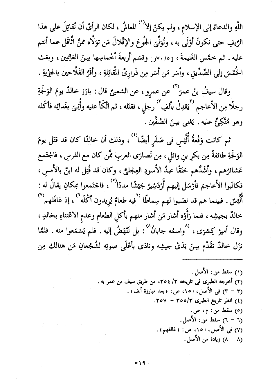 وَقَالَ سَيْفُ بْنُ عُمَرَ عَنْ عَمْرٍو، عَنِ الشَّعْبِيِّ قَالَ: بَارَزَ خَالِدٌ يَوْمَ الْوَلَجَةِ رَجُلًا مِنَ الْأَعَاجِمِ يَعْدِلُ بِأَلْفِ رَجُلٍ، فَقَتَلَهُ، ثُمَّ اتَّكَأَ عَلَيْهِ وَأُتِيَ بِغَدَائِهِ فَأَكَلَهُ وَهُوَ مُتَّكِئٌ عَلَيْهِ. يَعْنِي بَيْنَ الصَّفَّيْنِ.