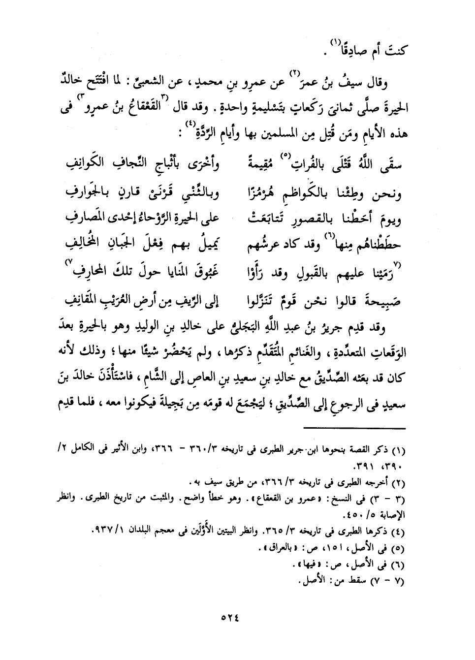 وَقَالَ سَيْفُ بْنُ عُمَرَ، عَنْ عَمْرِو بْنِ مُحَمَّدٍ، عَنِ الشَّعْبِيِّ: لَمَّا افْتَتَحَ خَالِدٌ الْحِيرَةَ صَلَّى ثَمَانِيَ رَكَعَاتٍ بِتَسْلِيمَةٍ وَاحِدَةٍ. وَقَدْ قَالَ الْقَعْقَاعُ بْنُ عَمْرٍو فِي هَذِهِ الْأَيَّامِ وَمَنْ قُتِلَ مِنَ الْمُسْلِمِينَ بِهَا وَأَيَّامِ الرِّدَّةِ: