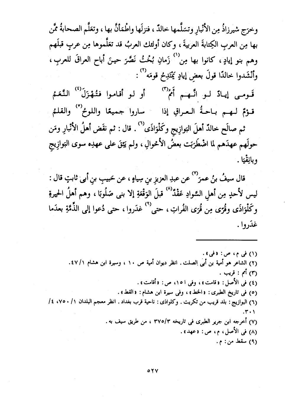 وَخَرَجَ شِيرْزَاذُ مِنَ الْأَنْبَارِ وَتَسَلَّمَهَا خَالِدٌ، فَنَزَلَهَا وَاطْمَأَنَّ بِهَا، وَتَعَلَّمَ الصَّحَابَةُ مِمَّنْ بِهَا مِنَ الْعَرَبِ الْكِتَابَةَ الْعَرَبِيَّةَ، وَكَانَ أُولَئِكَ الْعَرَبُ قَدْ تَعَلَّمُوهَا مِنْ عَرَبٍ قَبْلَهُمْ وَهُمْ بَنُو إِيَادٍ، كَانُوا بِهَا فِي زَمَانِ بُخْتَ نَصَّرَ حِينَ أَبَاحَ الْعِرَاقَ لِلْعَرَبِ، وَأَنْشَدُوا خَالِدًا قَوْلَ بَعْضِ إِيَادٍ يَمْتَدِحُ قَوْمَهُ: