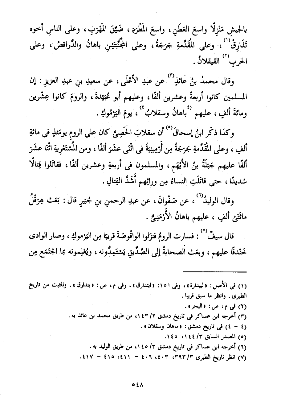 وَقَالَ مُحَمَّدُ بْنُ عَائِذٍ عَنْ عَبْدِ الْأَعْلَى، عَنْ سَعِيدِ بْنِ عَبْدِ الْعَزِيزِ: إِنَّ الْمُسْلِمِينَ كَانُوا أَرْبَعَةً وَعِشْرِينَ أَلْفًا، وَعَلَيْهِمْ أَبُو عُبَيْدَةَ، وَالرُّومُ كَانُوا عِشْرِينَ وَمِائَةَ أَلْفٍ، عَلَيْهِمْ بَاهَانُ وَسُقْلَابُ، يَوْمَ الْيَرْمُوكِ.