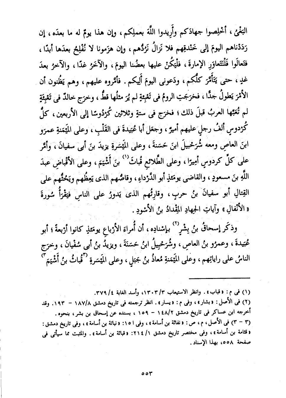 الْبَغْيُ، أَخْلِصُوا جِهَادَكُمْ وَأَرِيدُوا اللَّهَ بِعَمَلِكُمْ، وَإِنَّ هَذَا يَوْمٌ لَهُ مَا بَعْدَهُ، إِنْ رَدَدْنَاهُمُ الْيَوْمَ إِلَى خَنْدَقِهِمْ فَلَا نَزَالُ نَرُدُّهُمْ، وَإِنْ هَزَمُونَا لَا نُفْلِحُ بَعْدَهَا أَبَدًا، فَتَعَالَوْا فَلْنَتَعَاوَرِ الْإِمَارَةَ، فَلْيَكُنْ عَلَيْهَا بَعْضُنَا الْيَوْمَ، وَالْآخَرُ غَدًا، وَالْآخَرُ بَعْدَ غَدٍ، حَتَّى يَتَأَمَّرَ كُلُّكُمْ، وَدَعُونِي الْيَوْمَ أَلِيكُمْ. فَأَمَّرُوهُ عَلَيْهِمْ، وَهُمْ يَظُنُّونَ أَنَّ الْأَمْرَ يَطُولُ جِدًّا، فَخَرَجَتِ الرُّومُ فِي تَعْبِئَةٍ لَمْ يُرَ مِثْلُهَا قَطُّ، وَخَرَجَ خَالِدٌ فِي تَعْبِئَةٍ لَمْ تُعَبِّهَا الْعَرَبُ قَبْلَ ذَلِكَ ; فَخَرَجَ فِي سِتَّةٍ وَثَلَاثِينَ كُرْدُوسًا إِلَى الْأَرْبَعِينَ، كُلُّ كُرْدُوسٍ أَلْفُ رَجُلٍ عَلَيْهِمْ أَمِيرٌ، وَجَعَلَ أَبَا عُبَيْدَةَ فِي الْقَلْبِ، وَعَلَى الْمَيْمَنَةِ عَمْرُو بْنُ الْعَاصِ وَمَعَهُ شُرَحْبِيلَ ابْنَ حَسَنَةَ، وَعَلَى الْمَيْسَرَةِ يَزِيدَ بْنَ أَبِي سُفْيَانَ، وَأَمَّرَ عَلَى كُلِّ كُرْدُوسٍ أَمِيرًا، وَعَلَى الطَّلَائِعِ قُبَاثَ بْنَ أَشْيَمَ، وَعَلَى الْأَقْبَاضِ عَبْدَ اللَّهِ بْنِ مَسْعُودٍ، وَالْقَاضِي يَوْمَئِذٍ أَبُو الدَّرْدَاءِ، وَقَاصُّهُمُ الَّذِي يَعِظُهُمْ وَيَحُثُّهُمْ عَلَى الْقِتَالِ أَبُو سُفْيَانَ بْنُ حَرْبٍ، وَقَارِئُهُمِ الَّذِي يَدُورُ عَلَى النَّاسِ فَيَقْرَأُ سُورَةَ " الْأَنْفَالِ " وَآيَاتِ الْجِهَادِ الْمِقْدَادُ بْنُ الْأَسْوَدِ.