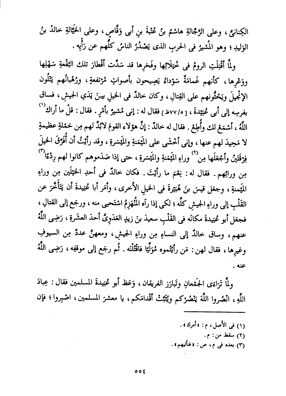 وَلَمَّا أَقْبَلَتِ الرُّومُ فِي خُيَلَائِهَا وَفَخْرِهَا قَدْ سَدَّتْ أَقْطَارَ تِلْكَ الْبُقْعَةِ سَهْلِهَا وَوَعْرِهَا، كَأَنَّهُمْ غَمَامَةٌ سَوْدَاءُ يَصِيحُونَ بِأَصْوَاتٍ مُرْتَفِعَةٍ، وَرُهْبَانُهُمْ يَتْلُونَ الْإِنْجِيلَ وَيُحِثُّونَهُمْ عَلَى الْقِتَالِ، وَكَانَ خَالِدٌ فِي الْخَيْلِ بَيْنَ يَدَيِ الْجَيْشِ، فَسَاقَ بِفَرَسِهِ إِلَى أَبِي عُبَيْدَةَ، فَقَالَ لَهُ: إِنِّي مُشِيرٌ بِأَمْرٍ. فَقَالَ: قُلْ مَا أَرَاكَ اللَّهُ، أَسْمَعْ لَكَ وَأُطِعْ. فَقَالَ لَهُ خَالِدٌ: إِنَّ هَؤُلَاءِ الْقَوْمَ لَا بُدَّ لَهُمْ مِنْ حَمْلَةٍ عَظِيمَةٍ لَا مَحِيدَ لَهُمْ عَنْهَا، وَإِنِّي أَخْشَى عَلَى الْمَيْمَنَةِ وَالْمَيْسَرَةِ، وَقَدْ رَأَيْتُ أَنْ أُفَرِّقَ الْخَيْلَ فِرْقَتَيْنِ وَأَجْعَلَهَا مِنْ وَرَاءِ الْمَيْمَنَةِ وَالْمَيْسَرَةِ، حَتَّى إِذَا صَدَمُوهُمْ كَانُوا لَهُمْ رِدْءًا مِنْ وَرَائِهِمْ. فَقَالَ لَهُ: نِعْمَ مَا رَأَيْتَ. فَكَانَ خَالِدٌ فِي أَحَدِ الْخَيَلِينَ مِنْ وَرَاءِ الْمَيْمَنَةِ، وَجَعَلَ قَيْسَ بْنَ هُبَيْرَةَ فِي الْخَيْلِ الْأُخْرَى، وَأَمَرَ أَبَا عُبَيْدَةَ أَنْ يَتَأَخَّرَ عَنِ الْقَلْبِ إِلَى وَرَاءِ الْجَيْشِ كُلِّهِ ; لِكَيْ إِذَا رَآهُ الْمُنْهَزِمُ اسْتَحْيَى مِنْهُ، وَرَجَعَ إِلَى الْقِتَالِ، فَجَعَلَ أَبُو عُبَيْدَةَ مَكَانَهُ فِي الْقَلْبِ سَعِيدَ بْنَ زَيْدٍ الْعَدَوِيَّ أَحَدَ الْعَشْرَةِ، رَضِيَ اللَّهُ عَنْهُمْ، وَسَاقَ خَالِدٌ إِلَى النِّسَاءِ مِنْ وَرَاءِ الْجَيْشِ، وَمَعَهُنَّ عَدَدٌ مِنَ السُّيُوفِ وَغَيْرِهَا، فَقَالَ لَهُنَّ: مَنْ رَأَيْتُمُوهُ مُولِّيًا فَاقْتُلْنَهُ. ثُمَّ رَجَعَ إِلَى مَوْقِفِهِ، رَضِيَ اللَّهُ عَنْهُ.