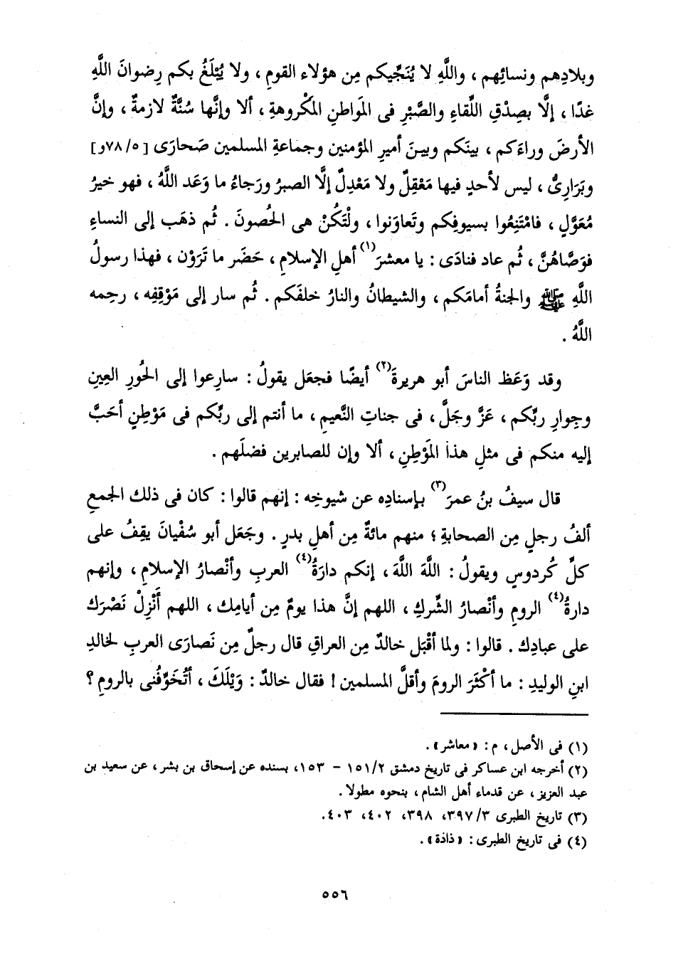وَبِلَادِهِمْ وَنِسَائِهِمْ، وَاللَّهِ لَا يُنَجِّيكُمْ مِنْ هَؤُلَاءِ الْقَوْمِ، وَلَا يُبْلَغُ بِكُمْ رِضْوَانَ اللَّهِ غَدًا، إِلَّا بِصِدْقِ اللِّقَاءِ وَالصَّبْرِ فِي الْمَوَاطِنِ الْمَكْرُوهَةِ، أَلَا وَإِنَّهَا سُنَّةٌ لَازِمَةٌ، وَإِنَّ الْأَرْضَ وَرَاءَكُمْ، بَيْنَكُمْ وَبَيْنَ أَمِيرِ الْمُؤْمِنِينَ وَجَمَاعَةِ الْمُسْلِمِينَ صَحَارَى وَبَرَارِيُّ، لَيْسَ لِأَحَدٍ فِيهَا مَعْقِلٌ وَلَا مَعْدِلٌ إِلَّا الصَّبْرُ وَرَجَاءُ مَا وَعَدَ اللَّهُ، فَهُوَ خَيْرُ مُعَوَّلٍ، فَامْتَنِعُوا بِسُيُوفِكُمْ وَتَعَاوَنُوا، وَلْتَكُنْ هِيَ الْحُصُونُ. ثُمَّ ذَهَبَ إِلَى النِّسَاءِ فَوَصَّاهُنَّ، ثُمَّ عَادَ فَنَادَى: يَا مَعَاشِرَ أَهْلِ الْإِسْلَامِ، حَضَرَ مَا تَرَوْنَ فَهَذَا رَسُولُ اللَّهِ صَلَّى اللَّهُ عَلَيْهِ وَسَلَّمَ وَالْجَنَّةُ أَمَامَكُمْ، وَالشَّيْطَانُ وَالنَّارُ خَلْفَكُمْ. ثُمَّ سَارَ إِلَى مَوْقِفِهِ، رَحِمَهُ اللَّهُ.