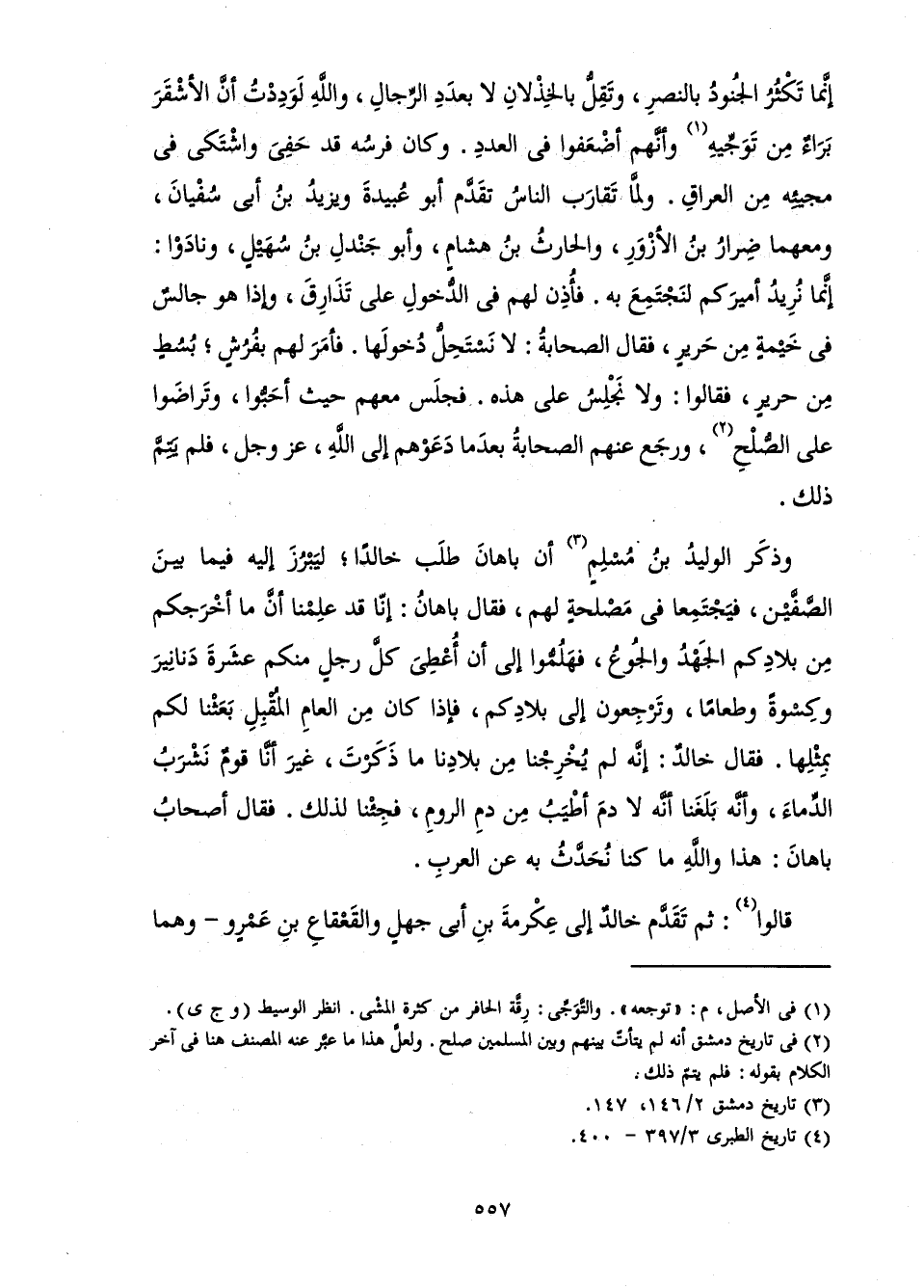 إِنَّمَا تَكْثُرُ الْجُنُودُ بِالنَّصْرِ، وَتَقِلُّ بِالْخِذْلَانِ لَا بِعَدَدِ الرِّجَالِ، وَاللَّهِ لَوَدِدْتُ أَنَّ الْأَشْقَرَ بَرَاءٌ مِنْ تَوَجِّيهِ وَأَنَّهُمْ أَضْعَفُوا فِي الْعَدَدِ. وَكَانَ فَرَسُهُ قَدْ حَفِيَ وَاشْتَكَى فِي مَجِيئِهِ مِنَ الْعِرَاقِ. وَلَمَّا تَقَارَبَ النَّاسُ تَقَدَّمَ أَبُو عُبَيْدَةَ وَيَزِيدُ بْنُ أَبِي سُفْيَانَ، وَمَعَهُمَا ضِرَارُ بْنُ الْأَزْوَرِ، وَالْحَارِثُ بْنُ هِشَامٍ، وَأَبُو جَنْدَلِ بْنُ سُهَيْلٍ، وَنَادَوْا: إِنَّمَا نُرِيدُ أَمِيرَكُمْ لِنَجْتَمِعَ بِهِ. فَأُذِنَ لَهُمْ فِي الدُّخُولِ عَلَى تَذَارِقَ، وَإِذَا هُوَ جَالَسٌ فِي خَيْمَةٍ مِنْ حَرِيرٍ، فَقَالَ الصَّحَابَةُ: لَا نَسْتَحِلُّ دُخُولَهَا. فَأَمَرَ لَهُمْ بِفُرُشٍ ; بُسُطٍ مِنْ حَرِيرٍ، فَقَالُوا: وَلَا نَجْلِسُ عَلَى هَذِهِ. فَجَلَسَ مَعَهُمْ حَيْثُ أَحَبُّوا، وَتَرَاضَوْا عَلَى الصُّلْحِ، وَرَجَعَ عَنْهُمُ الصَّحَابَةُ بَعْدَمَا دَعَوْهُمْ إِلَى اللَّهِ عَزَّ وَجَلَّ، فَلَمْ يَتِمَّ ذَلِكَ.