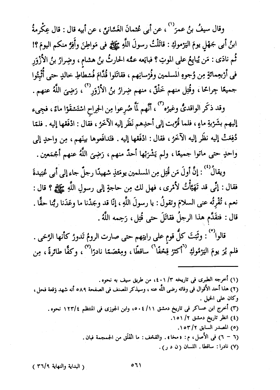 وَقَالَ سَيْفُ بْنُ عُمَرَ، عَنْ أَبِي عُثْمَانَ الْغَسَّانِيِّ، عَنْ أَبِيهِ قَالَ: قَالَ عِكْرِمَةُ بْنُ أَبِي جَهْلٍ: يَوْمَ الْيَرْمُوكِ قَاتَلْتُ رَسُولَ اللَّهِ صَلَّى اللَّهُ عَلَيْهِ وَسَلَّمَ فِي مَوَاطِنَ وَأَفِرُّ مِنْكُمُ الْيَوْمَ؟ ! ثُمَّ نَادَى: مَنْ يُبَايِعُ عَلَى الْمَوْتِ؟ فَبَايَعَهُ عَمُّهُ الْحَارِثُ بْنُ هِشَامٍ، وَضِرَارُ بْنُ الْأَزْوَرِ فِي أَرْبَعِمِائَةٍ مِنْ وُجُوهِ الْمُسْلِمِينَ وَفُرْسَانِهِمْ، فَقَاتَلُوا قُدَّامَ فُسْطَاطِ خَالِدٍ حَتَّى أُثْبِتُوا جَمِيعًا جِرَاحًا، وَقُتِلَ مِنْهُمْ خَلْقٌ، مِنْهُمْ ضِرَارُ بْنُ الْأَزْوَرِ، رِضَى اللَّهِ عَنْهُمْ.