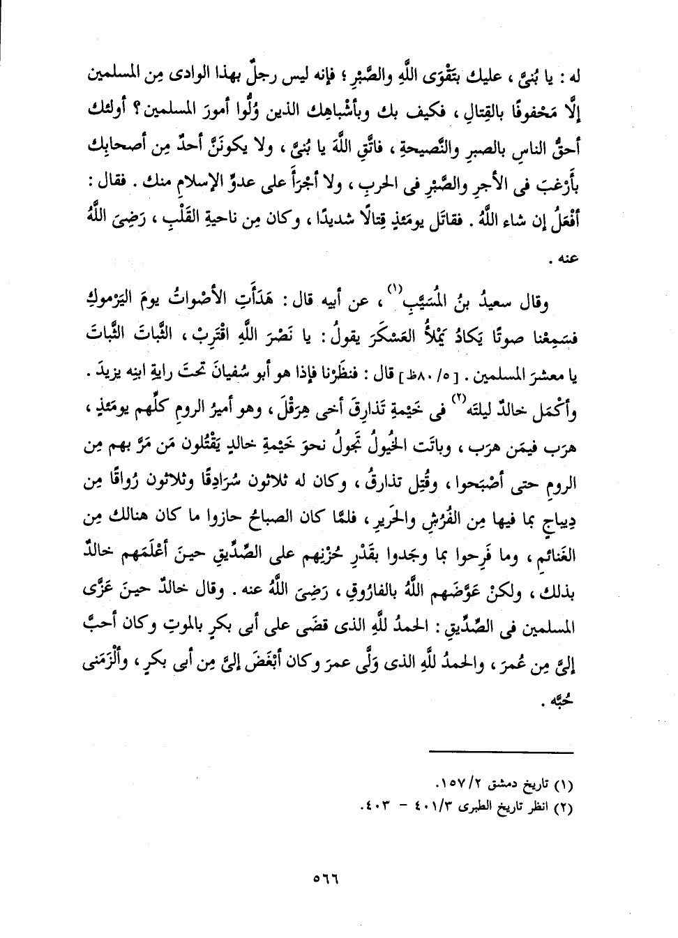 وَقَالَ سَعِيدُ بْنُ الْمُسَيِّبِ، عَنْ أَبِيهِ قَالَ: هَدَأَتِ الْأَصْوَاتُ يَوْمَ الْيَرْمُوكِ فَسَمِعْنَا صَوْتًا يَكَادُ يَمْلَأُ الْعَسْكَرَ يَقُولُ: يَا نَصْرَ اللَّهِ اقْتَرِبْ، الثَّبَاتَ الثَّبَاتَ يَا مَعْشَرَ الْمُسْلِمِينَ. قَالَ: فَنَظَرْنَا فَإِذَا هُوَ أَبُو سُفْيَانَ تَحْتَ رَايَةِ ابْنِهِ يَزِيدَ. .