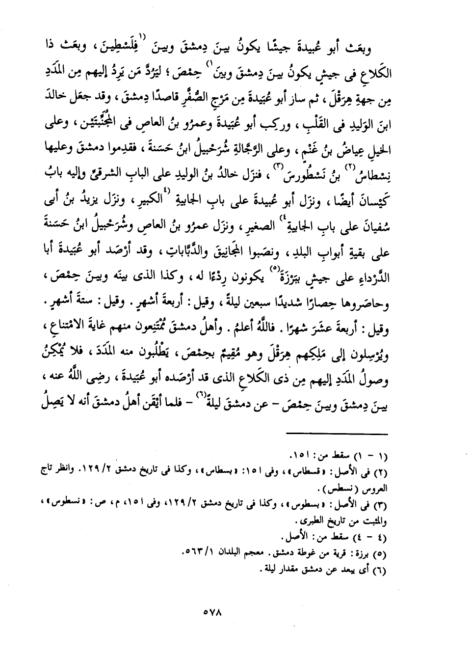 وَبَعَثَ أَبُو عُبَيْدَةَ جَيْشًا يَكُونُ بَيْنَ دِمَشْقَ وَبَيْنَ فِلَسْطِينَ، وَبَعَثَ ذَا الْكَلَاعِ فِي جَيْشٍ يَكُونُ بَيْنَ دِمَشْقَ وَبَيْنَ حِمْصَ ; لِيَرُدَّ مَنْ يَرِدُ إِلَيْهِمْ مِنَ الْمَدَدِ مِنْ جِهَةِ هِرَقْلَ، ثُمَّ سَارَ أَبُو عُبَيْدَةَ مِنْ مَرْجِ الصُّفَّرِ قَاصِدًا دِمَشْقَ، وَقَدْ جَعَلَ خَالِدَ بْنَ الْوَلِيدِ فِي الْقَلْبِ، وَرَكِبَ أَبُو عُبَيْدَةَ وَعَمْرُو بْنُ الْعَاصِ فِي الْمُجَنِّبَتَيْنِ، وَعَلَى الْخَيْلِ عِيَاضُ بْنُ غَنْمٍ،، وَعَلَى الرَّجَّالَةِ شُرَحْبِيلُ ابْنُ حَسَنَةَ، فَقَدِمُوا دِمَشْقَ وَعَلَيْهَا نِسْطَاسُ بْنُ نَسْطُورَسَ، فَنَزَلَ خَالِدُ بْنُ الْوَلِيدِ عَلَى الْبَابِ الشَّرْقِيِّ وَإِلَيْهِ بَابُ كَيْسَانَ أَيْضًا، وَنَزَلَ أَبُو عُبَيْدَةَ عَلَى بَابِ الْجَابِيَةِ الْكَبِيرِ، وَنَزَلَ يَزِيدُ بْنُ أَبِي سُفْيَانَ عَلَى بَابِ الْجَابِيَةِ الصَّغِيرِ، وَنَزَلَ عَمْرُو بْنُ الْعَاصِ وَشُرَحْبِيلُ ابْنُ حَسَنَةَ عَلَى بَقِيَّةِ أَبْوَابِ الْبَلَدِ، وَنَصَبُوا الْمَجَانِيقَ وَالدَّبَّابَاتِ وَقَدْ أَرْصَدَ أَبُو عُبَيْدَةَ أَبَا الدَّرْدَاءِ عَلَى جَيْشٍ بِبَرْزَةَ يَكُونُونَ رِدْءًا لَهُ، وَكَذَا الَّذِي بَيْنَهُ وَبَيْنَ حِمْصَ، وَحَاصَرُوهَا حِصَارًا شَدِيدًا سَبْعِينَ لَيْلَةً، وَقِيلَ: أَرْبَعَةَ أَشْهُرٍ. وَقِيلَ: سِتَّةَ أَشْهُرٍ. وَقِيلَ: أَرْبَعَةَ عَشَرَ شَهْرًا. فَاللَّهُ أَعْلَمُ. وَأَهْلُ دِمَشْقَ مُمْتَنِعُونَ مِنْهُمْ غَايَةَ الِامْتِنَاعِ، وَيُرْسِلُونَ إِلَى مَلِكِهِمْ هِرَقْلَ وَهُوَ مُقِيمٌ بِحِمْصَ يَطْلُبُونَ مِنْهُ الْمَدَدَ، فَلَا يُمْكِنُ وُصُولُ الْمَدَدِ إِلَيْهِمْ مِنْ ذِي الْكَلَاعِ الَّذِي قَدْ أَرْصَدَهُ أَبُو عُبَيْدَةَ، رَضِيَ اللَّهُ عَنْهُ بَيْنَ دِمَشْقَ وَبَيْنَ حِمْصَ - عَنْ دِمَشْقَ لَيْلَةً - فَلَمَّا أَيْقَنَ أَهْلُ دِمَشْقَ أَنَّهُ لَا يَصِلُ