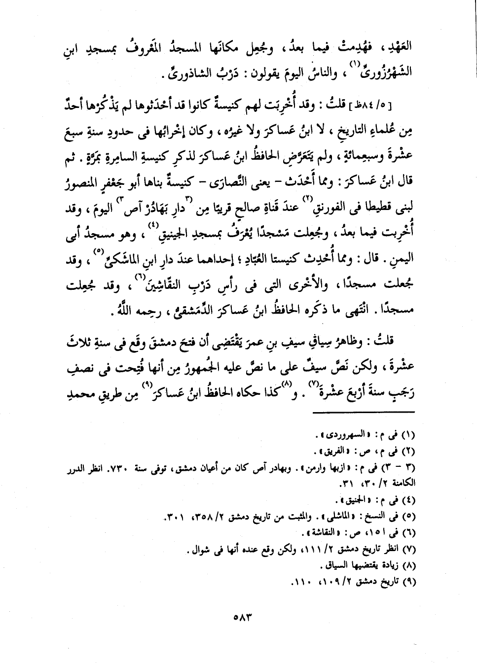 قُلْتُ: وَقَدْ أُخْرِبَتْ لَهُمْ كَنِيسَةٌ كَانُوا قَدْ أَحْدَثُوهَا لَمْ يَذْكُرْهَا أَحَدٌ مِنْ عُلَمَاءِ التَّارِيخِ، لَا ابْنُ عَسَاكِرَ وَلَا غَيْرُهُ، وَكَانَ إِخْرَابُهَا فِي حُدُودِ سَنَةِ سَبْعَ عَشْرَةَ وَسَبْعِمِائَةٍ، وَلَمْ يَتَعَرَّضِ الْحَافِظُ ابْنُ عَسَاكِرَ لِذِكْرِ كَنِيسَةِ السَّامِرَةِ بِمَرَّةٍ. ثُمَّ قَالَ ابْنُ عَسَاكِرَ: وَمِمَّا أَحْدَثَ - يَعْنِي النَّصَارَى - كَنِيسَةً بَنَاهَا أَبُو جَعْفَرٍ الْمَنْصُورُ لِبَنِي قُطَيْطَا فِي الْفَوْرَنْقِ عِنْدَ قَنَاةِ صَالِحٍ قَرِيبًا مِنْ دَارِ بَهَادُرْآصَ الْيَوْمَ، وَقَدْ أُخْرِبَتْ فِيمَا بَعْدُ، وَجُعِلَتْ مَسْجِدًا يُعَرَفُ بِمَسْجِدِ الْجَيْنِيقِ، وَهُوَ مَسْجِدُ أَبِي الْيَمَنِ. قَالَ: وَمِمَّا أُحْدِثَ كَنِيسَتَا الْعُبَّادِ ; إِحْدَاهُمَا عِنْدَ دَارِ ابْنِ الْمَاشَكِيِّ، وَقَدْ جُعِلَتْ مَسْجِدًا، وَالْأُخْرَى الَّتِي فِي رَأْسِ دَرْبِ النَّقَّاشِينَ، وَقَدْ جُعِلَتْ مَسْجِدًا. انْتَهَى مَا ذَكَرَهُ الْحَافِظُ ابْنُ عَسَاكِرَ الدِّمَشْقِيُّ، رَحِمَهُ اللَّهُ.