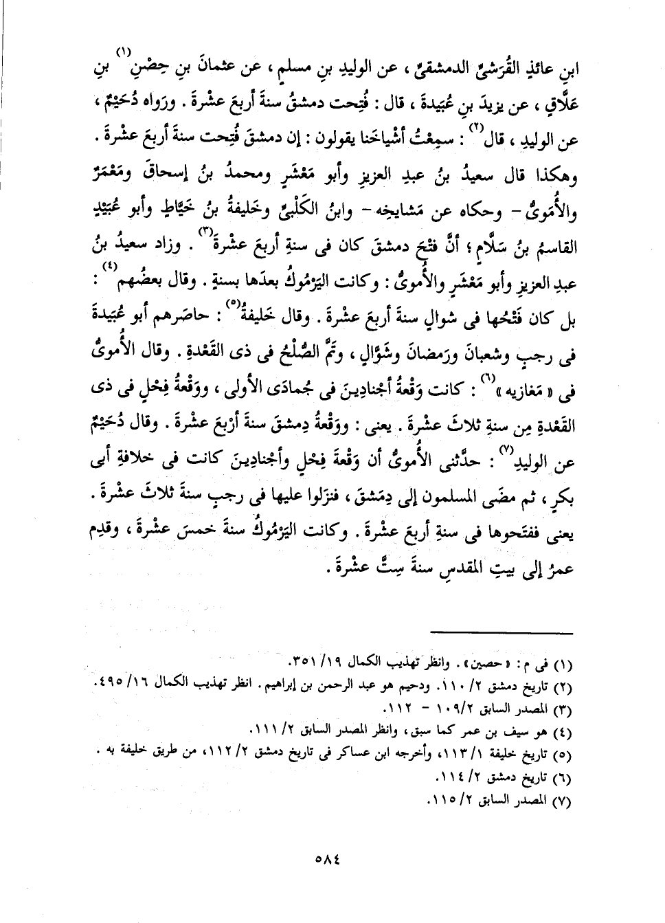 بْنِ عَائِذٍ الْقُرَشِيِّ الدِّمَشْقِيِّ، عَنِ الْوَلِيدِ بْنِ مُسْلِمٍ، عَنْ عُثْمَانَ بْنِ حِصْنِ بْنِ عَلَّاقٍ، عَنْ يَزِيدَ بْنِ عُبَيْدَةَ، قَالَ: فُتِحَتْ دِمَشْقُ سَنَةَ أَرْبَعَ عَشْرَةَ. وَرَوَاهُ دُحَيْمٌ، عَنِ الْوَلِيدِ، قَالَ: سَمِعْتُ أَشْيَاخًا يَقُولُونَ: إِنَّ دِمَشْقَ فُتِحَتْ سَنَةَ أَرْبَعَ عَشْرَةَ. وَهَكَذَا قَالَ سَعِيدُ بْنُ عَبْدِ الْعَزِيزِ وَأَبُو مَعْشَرٍ وَمُحَمَّدُ بْنُ إِسْحَاقَ وَمَعْمَرٌ وَالْأُمَوِيُّ - وَحَكَاهُ عَنْ مَشَايِخِهِ - وَابْنُ الْكَلْبِيِّ وَخَلِيفَةُ بْنُ خَيَّاطٍ وَأَبُو عُبَيْدٍ الْقَاسِمُ بْنُ سَلَّامٍ ; أَنَّ فَتْحَ دِمَشْقَ كَانَ فِي سَنَةِ أَرْبَعَ عَشْرَةَ. وَزَادَ سَعِيدُ بْنُ عَبْدِ الْعَزِيزِ وَأَبُو مَعْشَرٍ وَالْأُمَوِيُّ: وَكَانَتِ الْيَرْمُوكُ بَعْدَهَا بِسَنَةٍ. وَقَالَ بَعْضُهُمْ: بَلْ كَانَ فَتْحُهَا فِي شَوَّالٍ سَنَةَ أَرْبَعَ عَشْرَةَ. وَقَالَ خَلِيفَةُ: حَاصَرَهُمْ أَبُو عُبَيْدَةَ فِي رَجَبٍ وَشَعْبَانَ وَرَمَضَانَ وَشَوَّالٍ، وَتَمَّ الصُّلْحُ فِي ذِي الْقِعْدَةِ. وَقَالَ الْأُمَوِيُّ فِي " مُغَازِيهِ ": كَانَتْ وَقْعَةُ أَجْنَادِينَ فِي جُمَادَى الْأُولَى، وَوَقْعَةُ فِحْلٍ فِي ذِي الْقِعْدَةِ مِنْ سَنَةِ ثَلَاثَ عَشْرَةَ. يَعْنِي: وَوَقْعَةُ دِمَشْقَ سَنَةَ أَرْبَعَ عَشْرَةَ. وَقَالَ دُحَيْمٌ عَنِ الْوَلِيدِ: حَدَّثَنِي الْأُمَوِيُّ أَنَّ وَقْعَةَ فِحْلٍ وَأَجْنَادِينَ كَانَتْ فِي خِلَافَةِ أَبِي بَكْرٍ، ثُمَّ مَضَى الْمُسْلِمُونَ إِلَى دِمَشْقَ، فَنَزَلُوا عَلَيْهَا فِي رَجَبٍ سَنَةَ ثَلَاثَ عَشْرَةَ. يَعْنِي فَفَتَحُوهَا فِي سَنَةِ أَرْبَعَ عَشْرَةَ. وَكَانَتِ الْيَرْمُوكُ سَنَةَ خَمْسَ عَشْرَةَ، وَقَدِمَ عُمَرُ إِلَى بَيْتِ الْمَقْدِسِ سَنَةَ سِتَّ عَشْرَةَ.