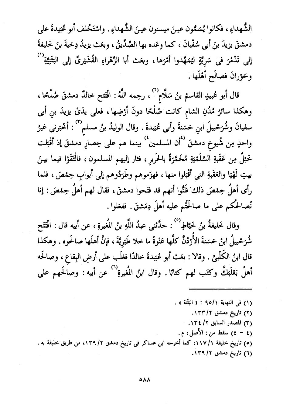 قَالَ أَبُو عُبَيْدٍ الْقَاسِمُ بْنُ سَلَّامٍ، رَحِمَهُ اللَّهُ: افْتَتَحَ خَالِدٌ دِمَشْقَ صُلْحًا، وَهَكَذَا سَائِرُ مُدُنِ الشَّامِ كَانَتْ صُلْحًا دُونَ أَرْضِهَا، فَعَلَى يَدَيْ يَزِيدَ بْنِ أَبِي سُفْيَانَ وَشُرَحْبِيلَ ابْنِ حَسَنَةَ وَأَبِي عُبَيْدَةَ. وَقَالَ الْوَلِيدُ بْنُ مُسْلِمٍ: أَخْبَرَنِي غَيْرُ وَاحِدٍ مِنْ شُيُوخِ دِمَشْقَ أَنَّ الْمُسْلِمِينَ بَيْنَمَا هُمْ عَلَى حِصَارِ دِمَشْقَ إِذْ أَقْبَلَتْ خَيْلٌ مِنْ عَقَبَةِ السَّلَمِيَّةِ مُخَمَّرَةٌ بِالْحَرِيرِ، فَثَارَ إِلَيْهِمُ الْمُسْلِمُونَ، فَالْتَقَوْا فِيمَا بَيْنَ بَيْتِ لَهْيَا وَالْعَقَبَةِ الَّتِي أَقْبَلُوا مِنْهَا، فَهَزَمُوهُمْ وَطَرَدُوهُمْ إِلَى أَبْوَابِ حِمْصَ، فَلَمَّا رَأَى أَهْلُ حِمْصَ ذَلِكَ ظَنُّوا أَنَّهُمْ قَدْ فَتَحُوا دِمَشْقَ، فَقَالَ لَهُمْ أَهْلُ حِمْصَ: إِنَّا نُصَالِحُكُمْ عَلَى مَا صَالَحْتُمْ عَلَيْهِ أَهْلَ دِمَشْقَ. فَفَعَلُوا.