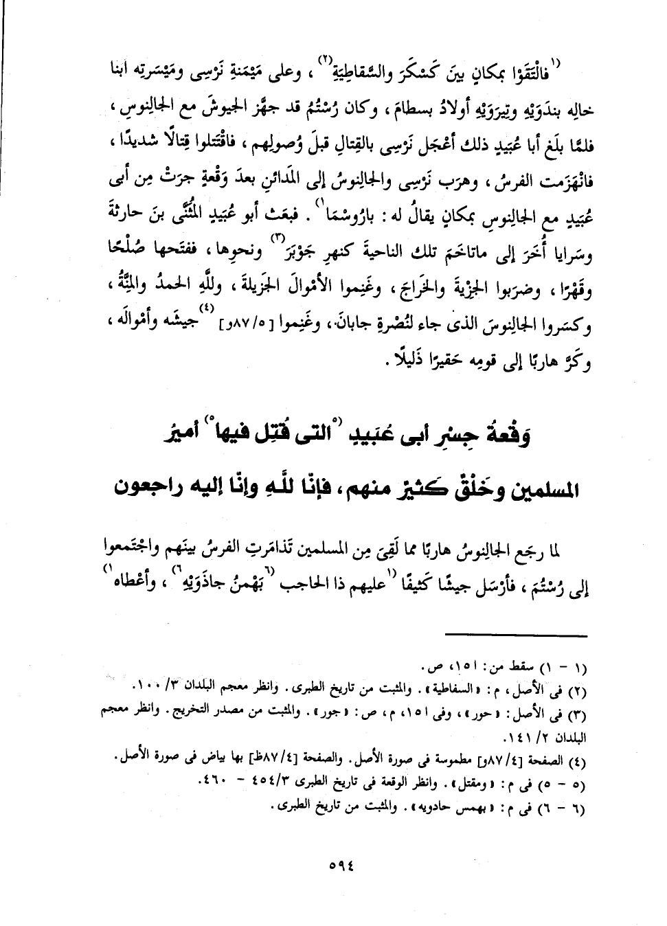 فَالْتَقَوْا بِمَكَانٍ بَيْنَ كَسْكَرَ وَالسَّقَاطِيَةِ، وَعَلَى مَيْمَنَةِ نَرْسِي وَمَيْسَرَتِهِ ابْنَا خَالِهِ بِنَدَوَيْهِ وَتِيرَوَيْهِ أَوْلَادُ بِسْطَامَ، وَكَانَ رُسْتُمُ قَدْ جَهَّزَ الْجُيُوشَ مَعَ الْجَالِنُوسِ، فَلَمَّا بَلَغَ أَبُو عُبَيْدٍ ذَلِكَ أَعْجَلَ نَرْسِي بِالْقِتَالِ قَبْلَ وُصُولِهِمْ، فَاقْتَتَلُوا قِتَالًا شَدِيدًا، فَانْهَزَمَتِ الْفُرْسُ وَهَرَبَ نَرْسِي وَالْجَالِنُوسُ إِلَى الْمَدَائِنِ بَعْدَ وَقْعَةٍ جَرَتْ مِنْ أَبِي عُبَيْدٍ مَعَ الْجَالِنُوسِ بِمَكَانٍ يُقَالُ لَهُ: بَارُوسْمَا. فَبَعَثَ أَبُو عُبَيْدٍ الْمُثَنَّى بْنَ حَارِثَةَ وَسَرَايَا أُخَرَ إِلَى مَا تَاخَمَ تِلْكَ النَّاحِيَةَ كَنَهْرِ جَوْبَرَ وَنَحْوِهَا، فَفَتَحَهَا صُلْحًا وَقَهْرًا، وَضَرَبُوا الْجِزْيَةَ وَالْخَرَاجَ، وَغَنِمُوا الْأَمْوَالَ الْجَزِيلَةَ، وَلِلَّهِ الْحَمْدُ وَالْمِنَّةُ، وَكَسَرُوا الْجَالِنُوسَ الَّذِي جَاءَ لِنُصْرَةِ جَابَانَ، وَغَنِمُوا جَيْشَهُ وَأَمْوَالَهُ، وَكَرَّ هَارِبًا إِلَى قَوْمِهِ حَقِيرًا ذَلِيلًا.