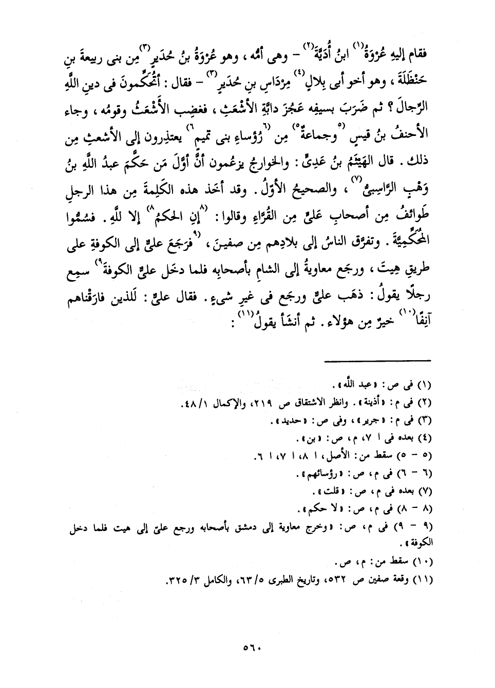 فَقَامَ إِلَيْهِ عُرْوَةُ ابْنُ أُدَيَّةَ - وَهِيَ أُمُّهُ، وَهُوَ عُرْوَةُ بْنُ حُدَيْرٍ مِنْ بَنِي رَبِيعَةَ بْنِ حَنْظَلَةَ، وَهُوَ أَخُو أَبِي بِلَالٍ مِرْدَاسِ بْنِ حُدَيْرٍ - فَقَالَ: أَتُحَكِّمُونَ فِي دِينِ اللَّهِ الرِّجَالَ؟ ثُمَّ ضَرَبَ بِسَيْفِهِ عَجُزَ دَابَّةِ الْأَشْعَثِ، فَغَضِبِ الْأَشْعَثُ وَقَوْمُهُ، وَجَاءَ الْأَحْنَفُ بْنُ قَيْسٍ وَجَمَاعَةٌ مِنْ رُؤَسَاءِ بَنِي تَمِيمٍ يَعْتَذِرُونَ إِلَى الْأَشْعَثِ مِنْ ذَلِكَ. قَالَ الْهَيْثَمُ بْنُ عَدِيٍّ وَالْخَوَارِجُ يَزْعُمُونَ أَنَّ أَوَّلَ مَنْ حَكَّمَ عَبْدُ اللَّهِ بْنُ وَهْبٍ الرَّاسِبِيُّ، وَالصَّحِيحُ الْأَوَّلُ. وَقَدْ أَخَذَ هَذِهِ الْكَلِمَةَ مِنْ هَذَا الرَّجُلِ طَوَائِفُ مِنْ أَصْحَابِ عَلِيٍّ مِنَ الْقُرَّاءِ وَقَالُوا: إِنِ الْحُكْمُ إِلَّا لِلَّهِ. فَسُمُّوا الْمُحَكِّمِيَّةَ. وَتَفَرَّقَ النَّاسُ إِلَى بِلَادِهِمْ مِنْ صِفِّينَ، فَرَجَعَ عَلِيٌّ إِلَى الْكُوفَةِ عَلَى طَرِيقِ هِيتَ، وَرَجَعَ مُعَاوِيَةُ إِلَى الشَّامِ بِأَصْحَابِهِ، فَلَمَّا دَخَلَ عَلِيٌّ الْكُوفَةَ سَمِعَ رَجُلًا يَقُولُ: ذَهَبَ عَلِيٌّ وَرَجَعَ فِي غَيْرِ شَيْءٍ. فَقَالَ عَلِيٌّ: لَلَّذِينَ فَارَقْنَاهُمْ آنِفًا خَيْرٌ مِنْ هَؤُلَاءِ. ثُمَّ أَنْشَأَ يَقُولُ:
