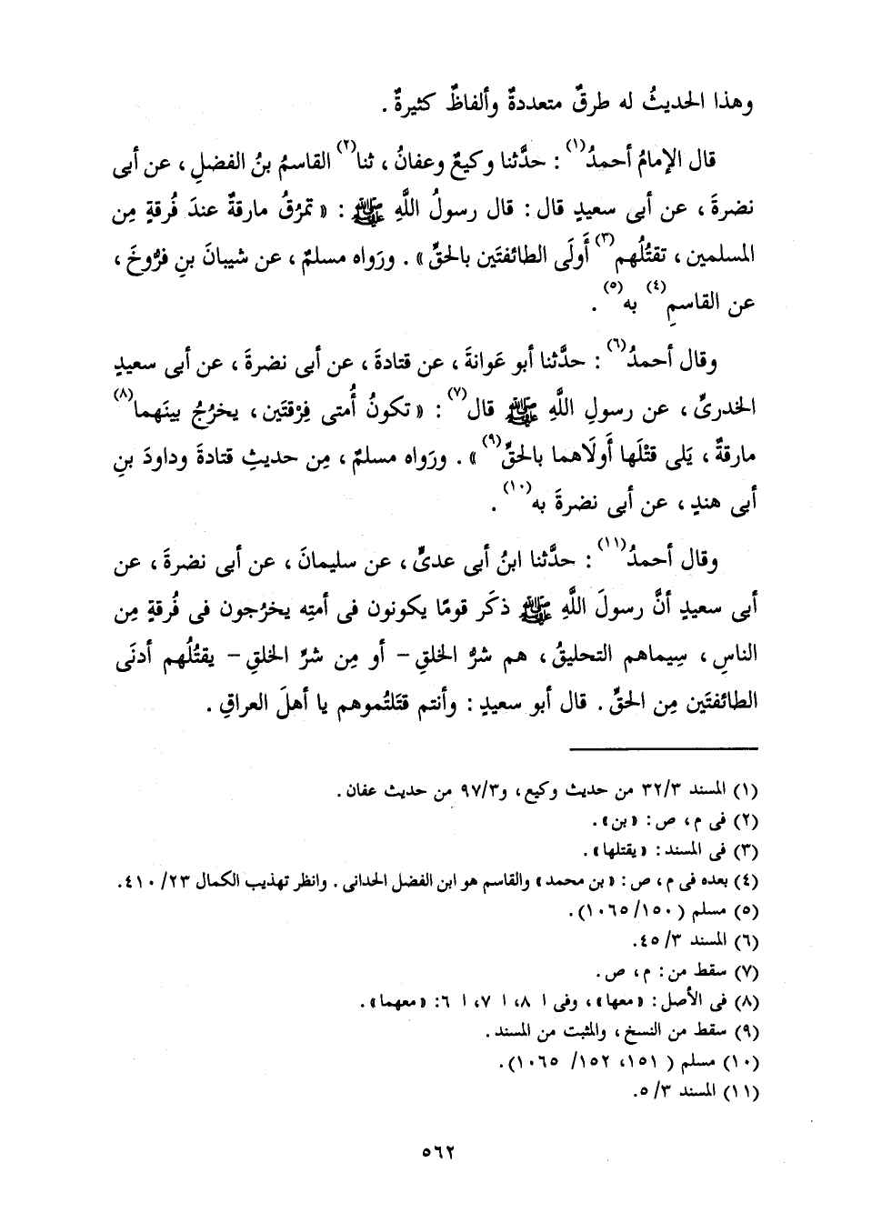 قَالَ الْإِمَامُ أَحْمَدُ: حَدَّثَنَا وَكِيعٌ وَعَفَّانُ، ثَنَا الْقَاسِمُ بْنُ الْفَضْلِ، عَنْ أَبِي نَضْرَةَ، عَنْ أَبِي سَعِيدٍ قَالَ: قَالَ رَسُولُ اللَّهِ، صَلَّى اللَّهُ عَلَيْهِ وَسَلَّمَ: «تَمْرُقُ مَارِقَةٌ عِنْدَ فُرْقَةٍ مِنَ الْمُسْلِمِينَ تَقْتُلُهُمْ أَوْلَى الطَّائِفَتَيْنِ بِالْحَقِّ» . وَرَوَاهُ مُسْلِمٌ، عَنْ شَيْبَانَ بْنِ فَرُّوخَ، عَنِ الْقَاسِمِ بِهِ.