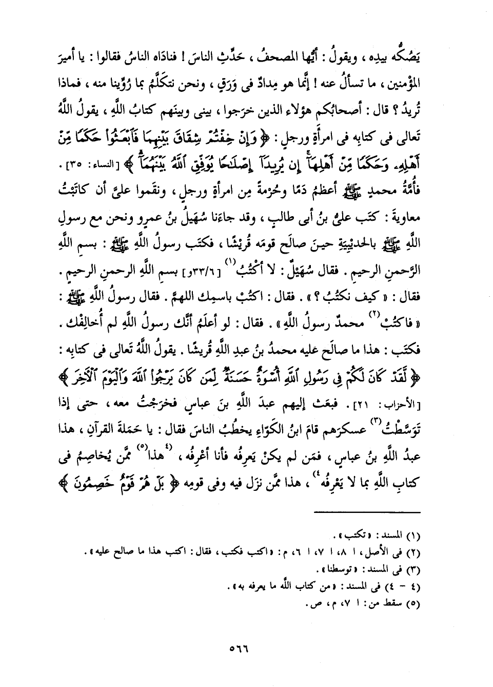يَصُكُّهُ بِيَدِهِ، وَيَقُولُ: أَيُّهَا الْمُصْحَفُ، حَدِّثِ النَّاسِ! فَنَادَاهُ النَّاسُ فَقَالُوا: يَا أَمِيرَ الْمُؤْمِنِينَ مَا تَسْأَلُ عَنْهُ! إِنَّمَا هُوَ مِدَادٌ فِي وَرَقٍ، وَنَحْنُ نَتَكَلَّمُ بِمَا رُوِّينَا مِنْهُ، فَمَاذَا تُرِيدُ؟ قَالَ: أَصْحَابُكُمْ هَؤُلَاءِ الَّذِينَ خَرَجُوا، بَيْنِي وَبَيْنَهُمْ كِتَابُ اللَّهِ، يَقُولُ اللَّهُ تَعَالَى فِي كِتَابِهِ فِي امْرَأَةٍ وَرَجُلٍ: {وَإِنْ خِفْتُمْ شِقَاقَ بَيْنِهِمَا فَابْعَثُوا حَكَمًا مِنْ أَهْلِهِ وَحَكَمًا مِنْ أَهْلِهَا إِنْ يُرِيدَا إِصْلَاحًا يُوَفِّقِ اللَّهُ بَيْنَهُمَا} [النساء: 35] . فَأُمَّةُ مُحَمَّدٍ، صَلَّى اللَّهُ عَلَيْهِ وَسَلَّمَ، أَعْظَمُ دَمًا وَحُرْمَةً مِنَ امْرَأَةٍ وَرَجُلٍ، وَنَقِمُوا عَلَيَّ أَنْ كَاتَبْتُ مُعَاوِيَةَ: كَتَبَ عَلِيُّ بْنُ أَبِي طَالِبٍ، وَقَدْ جَاءَنَا سُهَيْلُ بْنُ عَمْرٍو وَنَحْنُ مَعَ رَسُولِ اللَّهِ، صَلَّى اللَّهُ عَلَيْهِ وَسَلَّمَ، بِالْحُدَيْبِيَةَ حِينَ صَالَحَ قَوْمَهُ قُرَيْشًا، فَكَتَبَ رَسُولُ اللَّهِ، صَلَّى اللَّهُ عَلَيْهِ وَسَلَّمَ: بِسْمِ اللَّهِ الرَّحْمَنِ الرَّحِيمِ. فَقَالَ سُهَيْلُ: لَا أَكْتُبُ بِسْمِ اللَّهِ الرَّحْمَنِ الرَّحِيمِ. فَقَالَ: " كَيْفَ نَكْتُبُ؟ ". فَقَالَ: اكْتُبْ بِاسْمِكَ اللَّهُمَّ. فَقَالَ رَسُولُ اللَّهِ، صَلَّى اللَّهُ عَلَيْهِ وَسَلَّمَ: " فَكَتَبَ: هَذَا مَا صَالَحَ عَلَيْهِ مُحَمَّدُ بْنُ عَبْدِ اللَّهِ قُرَيْشًا. يَقُولُ اللَّهُ تَعَالَى فِي كِتَابِهِ: {لَقَدْ كَانَ لَكُمْ فِي رَسُولِ اللَّهِ أُسْوَةٌ حَسَنَةٌ لِمَنْ كَانَ يَرْجُو اللَّهَ وَالْيَوْمَ الْآخِرَ} [الأحزاب: 21] فَبَعَثَ إِلَيْهِمْ عَبْدَ اللَّهِ بْنَ عَبَّاسٍ فَخَرَجْتُ مَعَهُ، حَتَّى إِذَا تَوَسَّطْتُ عَسْكَرَهُمْ قَامَ ابْنُ الْكَوَّاءِ يَخْطُبُ النَّاسَ فَقَالَ: يَا حَمَلَةَ الْقُرْآنِ، هَذَا عَبْدُ اللَّهِ بْنُ عَبَّاسٍ فَمَنْ لَمْ يَكُنْ يَعْرِفُهُ فَأَنَا أَعْرِفُهُ، هَذَا مِمَّنْ يُخَاصِمُ فِي كِتَابِ اللَّهِ بِمَا لَا يَعْرِفُهُ، هَذَا مِمَّنْ نَزَلَ فِيهِ وَفِي قَوْمِهِ {بَلْ هُمْ قَوْمٌ خَصِمُونَ} [الزخرف: 58]