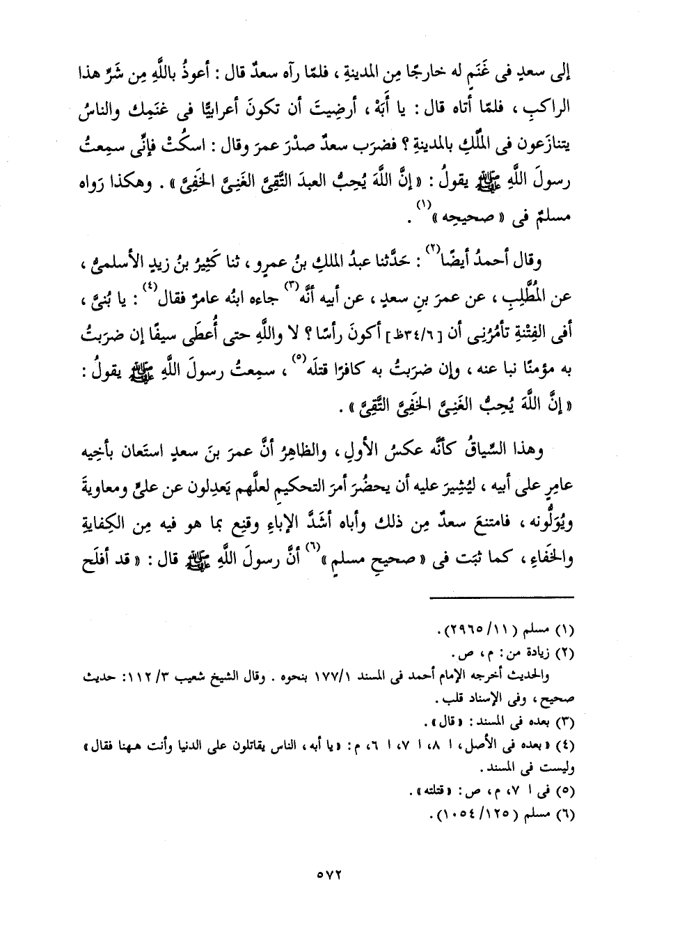 إِلَى سَعْدٍ فِي غَنَمٍ لَهُ خَارِجًا مِنَ الْمَدِينَةِ، فَلَمَّا رَآهُ سَعْدٌ قَالَ: أَعُوذُ بِاللَّهِ مِنْ شَرِّ هَذَا الرَّاكِبِ، فَلَمَّا أَتَاهُ قَالَ: يَا أَبَهْ، أَرَضِيتَ أَنْ تَكُونَ أَعْرَابِيًّا فِي غَنَمِكَ وَالنَّاسُ يَتَنَازَعُونَ فِي الْمُلْكِ بِالْمَدِينَةِ؟ فَضَرَبَ سَعْدٌ صَدْرَ عُمَرَ وَقَالَ: اسْكُتْ فَإِنِّي سَمِعْتُ رَسُولَ اللَّهِ، صَلَّى اللَّهُ عَلَيْهِ وَسَلَّمَ، يَقُولُ: «إِنَّ اللَّهَ يُحِبُّ الْعَبْدَ التَّقِيَّ الْغَنِيَّ الْخَفِيَّ» . وَهَكَذَا رَوَاهُ مُسْلِمٌ فِي " صَحِيحِهِ ".