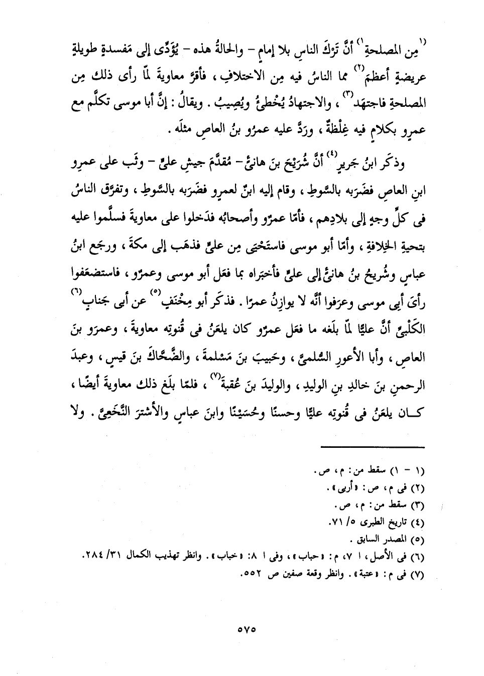 مِنَ الْمَصْلَحَةِ أَنَّ تَرْكَ النَّاسِ بِلَا إِمَامٍ - وَالْحَالَةُ هَذِهِ - يُؤَدِّي إِلَى مَفْسَدَةٍ طَوِيلَةٍ عَرِيضَةٍ أَعْظَمَ مِمَّا النَّاسُ فِيهِ مِنَ الِاخْتِلَافِ، فَأَقَرَّ مُعَاوِيَةَ لَمَّا رَأَى ذَلِكَ مِنَ الْمَصْلَحَةِ فَاجْتَهَدَ، وَالِاجْتِهَادُ يُخْطِئُ وَيُصِيبُ. وَيُقَالُ: إِنَّ أَبَا مُوسَى تَكَلَّمَ مَعَ عَمْرٍو بِكَلَامِ فِيهِ غِلْظَةٌ، وَرَدَّ عَلَيْهِ عَمْرُو بْنُ الْعَاصِ مِثْلَهُ.