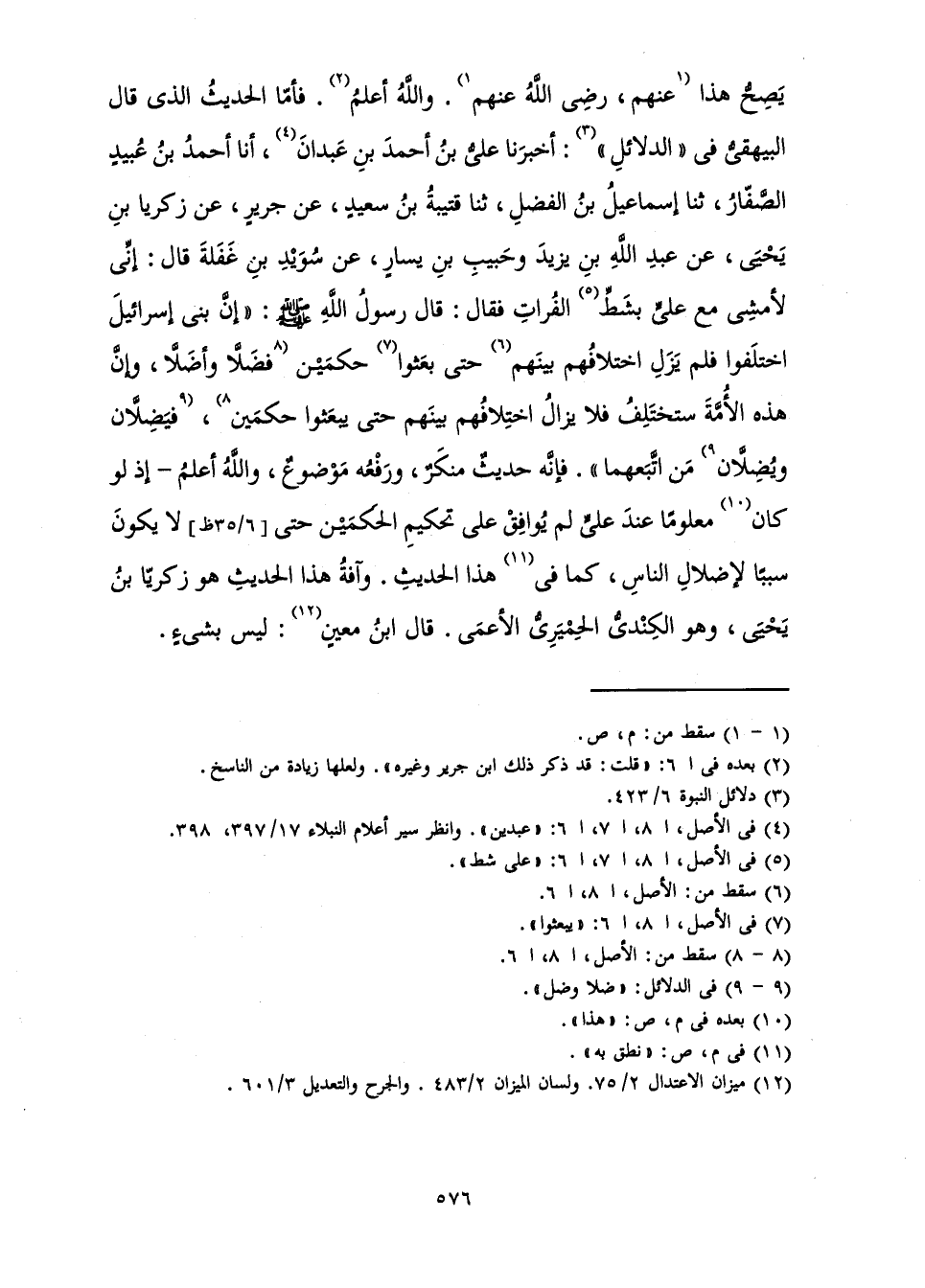 يَصِحُّ هَذَا عَنْهُمْ، رَضِيَ اللَّهُ عَنْهُمْ. وَاللَّهُ أَعْلَمُ. فَأَمَّا الْحَدِيثُ الَّذِي قَالَ الْبَيْهَقِيُّ فِي " الدَّلَائِلِ ": أَخْبَرَنَا عَلِيُّ بْنُ أَحْمَدَ بْنِ عَبْدَانَ، أَنَا أَحْمَدُ بْنُ عُبَيْدٍ الصَّفَّارُ، ثَنَا إِسْمَاعِيلُ بْنُ الْفَضْلِ، ثَنَا قُتَيْبَةُ بْنُ سَعِيدٍ، عَنْ جَرِيرٍ، عَنْ زَكَرِيَّا بْنِ يَحْيَى، عَنْ عَبْدِ اللَّهِ بْنِ يَزِيدَ وَحَبِيبِ بْنِ يَسَارٍ، عَنْ سُوَيْدِ بْنِ غَفَلَةَ قَالَ: إِنِّي لَأَمْشِي مَعَ عَلِيٍّ بِشَطِّ الْفُرَاتِ فَقَالَ: قَالَ رَسُولُ اللَّهِ، صَلَّى اللَّهُ عَلَيْهِ وَسَلَّمَ: «إِنَّ بَنِي إِسْرَائِيلَ اخْتَلَفُوا فَلَا يَزَالُ اخْتِلَافُهُمْ بَيْنَهُمْ حَتَّى يَبْعَثُوا حَكَمَيْنِ فَضَلَّا وَأَضَلَّا، وَإِنَّ هَذِهِ الْأُمَّةَ سَتَخْتَلِفُ فَلَا يَزَالُ اخْتِلَافُهُمْ بَيْنَهُمْ حَتَّى يَبْعَثُوا حَكَمَيْنِ، فَيَضِلَّانِ وَيُضِلَّانِ مَنِ اتَّبَعَهُمَا» . فَإِنَّهُ حَدِيثٌ مُنْكَرٌ وَرَفْعُهُ مَوْضُوعٌ، وَاللَّهُ أَعْلَمُ - إِذْ لَوْ كَانَ هَذَا مَعْلُومًا عِنْدَ عَلِيٍّ لَمْ يُوَافِقْ عَلَى تَحْكِيمِ الْحَكَمَيْنِ حَتَّى لَا يَكُونَ سَبَبًا لِإِضْلَالِ النَّاسِ، كَمَا فِي هَذَا الْحَدِيثِ. وَآفَةُ هَذَا الْحَدِيثِ هُوَ زَكَرِيَّا بْنُ يَحْيَى، وَهُوَ الْكِنْدِيُّ الْحِمْيَرِيُّ الْأَعْمَى. قَالَ ابْنُ مَعِينٍ: لَيْسَ بِشَيْءٍ.