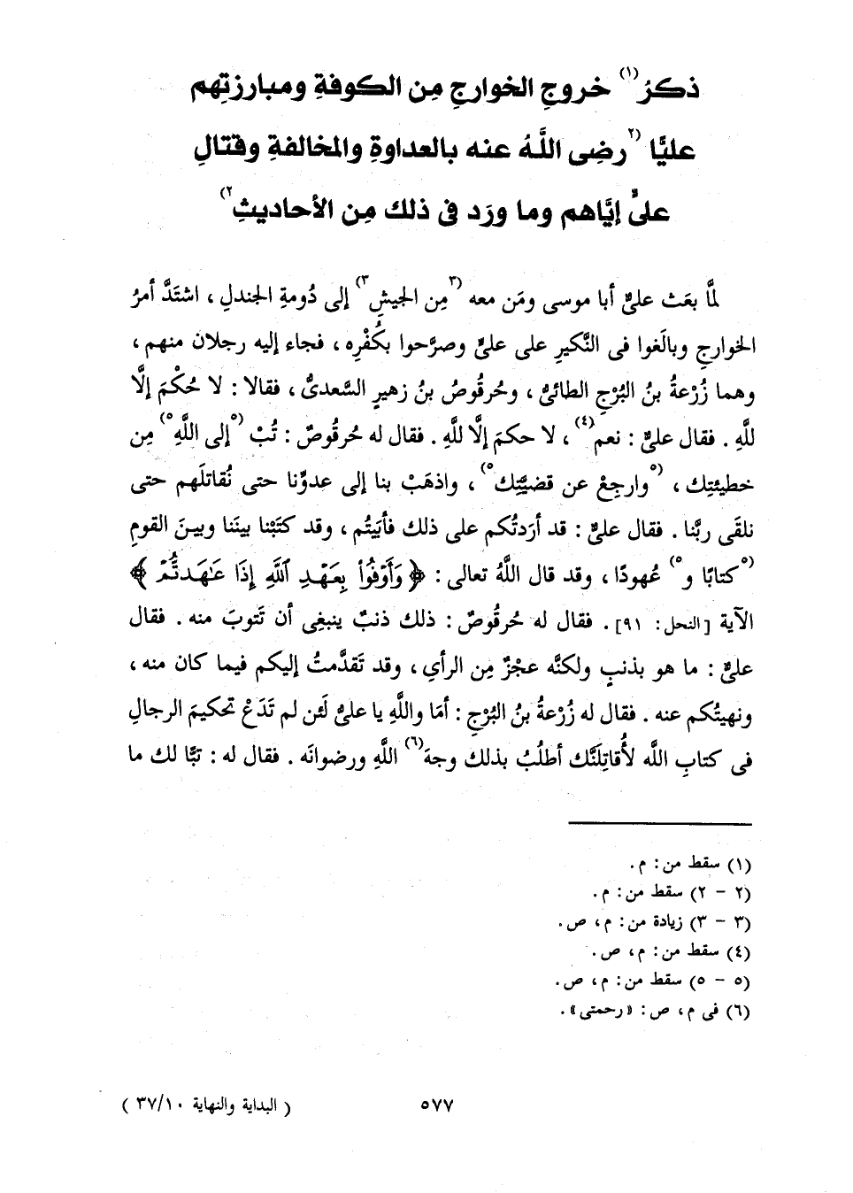 لَمَّا بَعَثَ عَلِيٌّ أَبَا مُوسَى وَمَنْ مَعَهُ مِنَ الْجَيْشِ إِلَى دُومَةِ الْجَنْدَلِ، اشْتَدَّ أَمْرُ الْخَوَارِجِ وَبَالَغُوا فِي النَّكِيرِ عَلَى عَلِيٍّ وَصَرَّحُوا بِكُفْرِهِ، فَجَاءَ إِلَيْهِ رَجُلَانِ مِنْهُمْ، وَهَمَا زُرْعَةُ بْنُ الْبُرْجِ الطَّائِيُّ، وَحُرْقُوصُ بْنُ زُهَيْرٍ السَّعْدِيُّ، فَقَالَا: لَا حُكْمَ إِلَّا لِلَّهِ. فَقَالَ عَلِيٌّ: لَا حُكْمَ إِلَّا لِلَّهِ. فَقَالَ لَهُ حُرْقُوصُ: تُبْ إِلَى اللَّهِ مِنْ خَطِيئَتِكَ، وَارْجِعْ عَنْ قَضِيَّتِكَ، اذْهَبْ بِنَا إِلَى عَدُوِّنَا حَتَّى نُقَاتِلَهُمْ حَتَّى نَلْقَى رَبَّنَا. فَقَالَ عَلِيٌّ: قَدْ أَرَدْتُكُمْ عَلَى ذَلِكَ فَأَبَيْتُمْ، وَقَدْ كَتَبْنَا بَيْنَنَا وَبَيْنَ الْقَوْمِ كِتَابًا وَعُهُودًا، وَقَدْ قَالَ اللَّهُ تَعَالَى: {وَأَوْفُوا بِعَهْدِ اللَّهِ إِذَا عَاهَدْتُمْ} [النحل: 91] الْآيَةَ [النَّحْلِ: 91] . فَقَالَ لَهُ حُرْقُوصُ: ذَلِكَ ذَنْبٌ يَنْبَغِي أَنْ تَتُوبَ مِنْهُ. فَقَالَ عَلِيٌّ: مَا هُوَ بِذَنْبٍ وَلَكِنَّهُ عَجْزٌ مِنَ الرَّأْيِ، وَقَدْ تَقَدَّمْتُ إِلَيْكُمْ فِيمَا كَانَ مِنْهُ، وَنَهَيْتُكُمْ عَنْهُ. فَقَالَ لَهُ زُرْعَةُ بْنُ الْبُرْجِ: أَمَا وَاللَّهِ يَا عَلِيُّ لَئِنْ لَمْ تَدَعْ تَحْكِيمَ الرِّجَالِ فِي كِتَابِ اللَّهِ لَأُقَاتِلَنَّكَ أَطْلُبُ بِذَلِكَ وَجْهَ اللَّهِ وَرِضْوَانَهُ. فَقَالَ لَهُ: تَبًّا لَكَ مَا