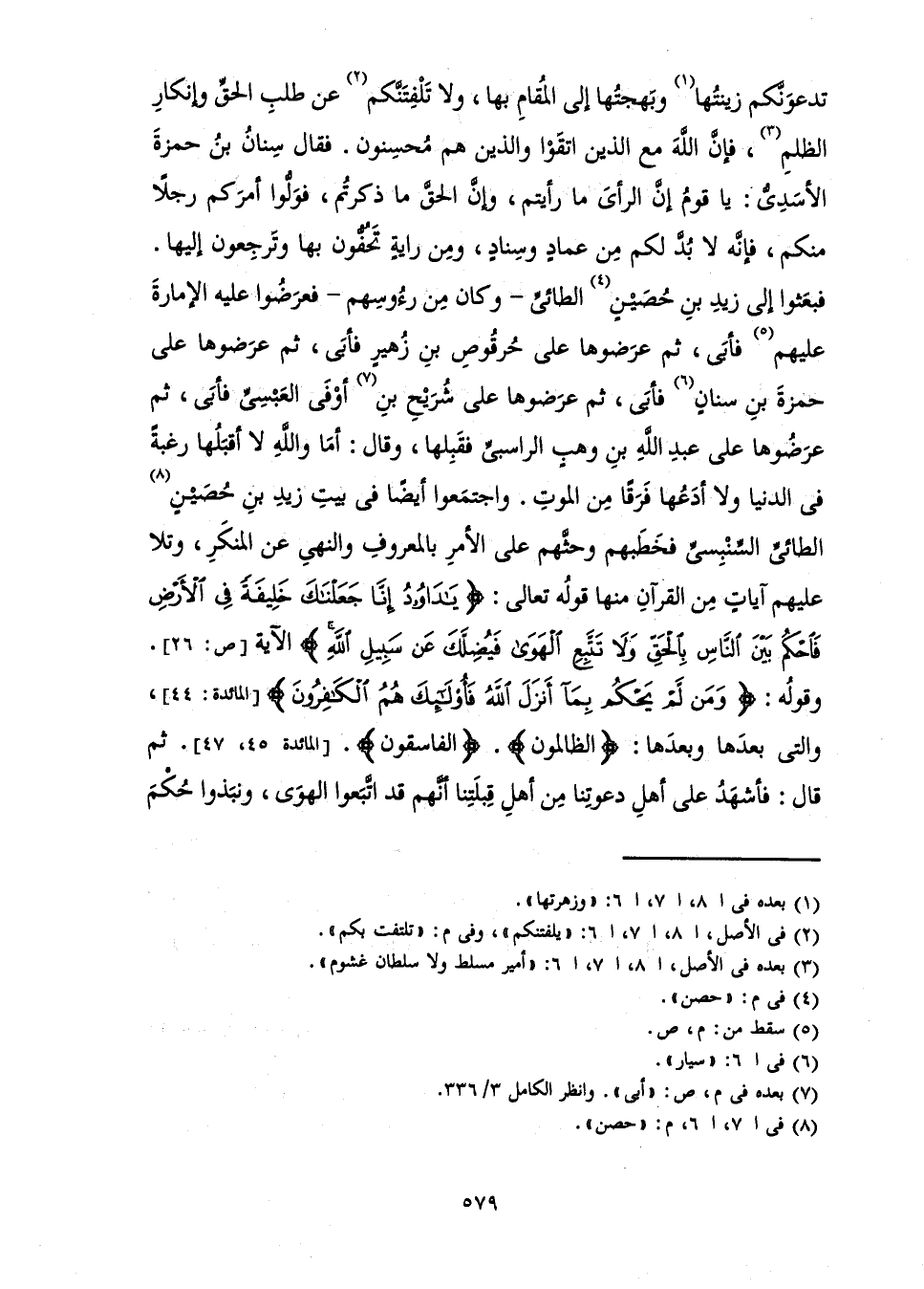 تَدْعُوَنَّكُمْ زِينَتُهَا وَبَهْجَتُهَا إِلَى الْمُقَامِ بِهَا، وَلَا تَلْفِتَنَّكُمْ عَنْ طَلَبِ الْحَقِّ وَإِنْكَارِ الظُّلْمِ، فَإِنَّ اللَّهَ مَعَ الَّذِينَ اتَّقَوْا وَالَّذِينَ هُمْ مُحْسِنُونَ. فَقَالَ سِنَانُ بْنُ حَمْزَةَ الْأَسَدِيُّ: يَا قَوْمُ إِنَّ الرَّأْيَ مَا رَأَيْتُمْ، وَإِنَّ الْحَقَّ مَا ذَكَرْتُمْ، فَوَلُّوا أَمْرَكُمْ رَجُلًا مِنْكُمْ، فَإِنَّهُ لَا بُدَّ لَكُمْ مِنْ عِمَادٍ وَسِنَادٍ، وَمِنْ رَايَةٍ تَحُفُّونَ بِهَا وَتَرْجِعُونَ إِلَيْهَا. فَبَعَثُوا إِلَى زَيْدِ بْنِ حُصَيْنٍ الطَّائِيِّ - وَكَانَ مِنْ رُءُوسِهِمْ - فَعَرَضُوا عَلَيْهِ الْإِمَارَةَ عَلَيْهِمْ فَأَبَى، ثُمَّ عَرَضُوهَا عَلَى حُرْقُوصَ بْنَ زُهَيْرٍ فَأَبَى، ثُمَّ عَرَضُوهَا عَلَى حَمْزَةَ بْنِ سِنَانٍ فَأَبَى، ثُمَّ عَرَضُوهَا عَلَى شُرَيْحِ بْنِ أَوْفَى الْعَبْسِيِّ فَأَبَى، ثُمَّ عَرَضُوهَا عَلَى عَبْدِ اللَّهِ بْنِ وَهْبٍ الرَّاسِبِيِّ فَقَبِلَهَا، وَقَالَ: أَمَا وَاللَّهِ لَا أَقْبَلُهَا رَغْبَةً فِي الدُّنْيَا وَلَا أَدَعُهَا فَرَقًا مِنَ الْمَوْتِ. وَاجْتَمَعُوا أَيْضًا فِي بَيْتِ زَيْدِ بْنِ حُصَيْنٍ الطَّائِيِّ السِّنْبِسِيِّ فَخَطَبَهُمْ وَحَثَّهُمْ عَلَى الْأَمْرِ بِالْمَعْرُوفِ وَالنَّهْيِ عَنِ الْمُنْكَرِ، وَتَلَا عَلَيْهِمْ آيَاتٍ مِنَ الْقُرْآنِ مِنْهَا قَوْلُهُ تَعَالَى: {يَا دَاوُدُ إِنَّا جَعَلْنَاكَ خَلِيفَةً فِي الْأَرْضِ فَاحْكُمْ بَيْنَ النَّاسِ بِالْحَقِّ وَلَا تَتَّبِعِ الْهَوَى فَيُضِلَّكَ عَنْ سَبِيلِ اللَّهِ} [ص: 26] الْآيَةَ [ص: 26] . وَقَوْلُهُ: {وَمَنْ لَمْ يَحْكُمْ بِمَا أَنْزَلَ اللَّهُ فَأُولَئِكَ هُمُ الْكَافِرُونَ} [المائدة: 44] . وَالَّتِي بَعْدَهَا وَبَعْدَهَا: الظَّالِمُونَ، الْفَاسِقُونَ [الْمَائِدَةِ: 45، 47] . ثُمَّ قَالَ: فَأَشْهَدُ عَلَى أَهْلِ دَعْوَتِنَا مِنْ أَهْلِ قِبْلَتِنَا أَنَّهُمْ قَدِ اتَّبَعُوا الْهَوَى، وَنَبَذُوا حُكْمَ