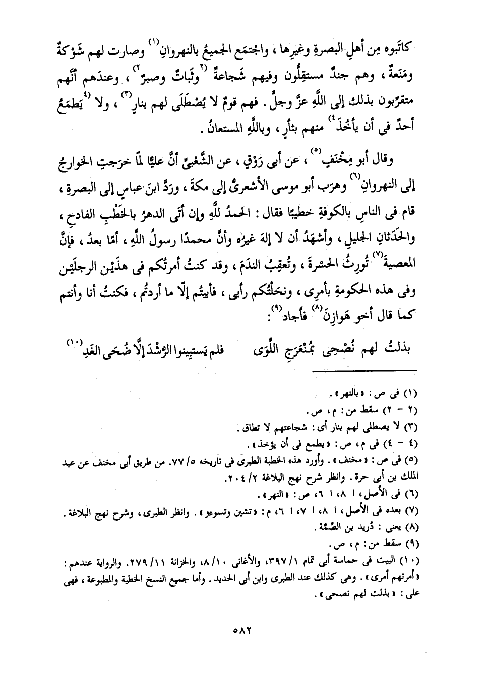 وَقَالَ أَبُو مِخْنَفٍ، عَنْ أَبِي رَوْقٍ، عَنِ الشَّعْبِيِّ أَنَّ عَلِيًّا لَمَّا خَرَجَتِ الْخَوَارِجُ إِلَى النَّهْرَوَانِ وَهَرَبَ أَبُو مُوسَى الْأَشْعَرِيُّ إِلَى مَكَّةَ، وَرَدَّ ابْنَ عَبَّاسٍ إِلَى الْبَصْرَةِ، قَامَ فِي النَّاسِ بِالْكُوفَةِ خَطِيبًا فَقَالَ: الْحَمْدُ لِلَّهِ وَإِنْ أَتَى الدَّهْرُ بِالْخَطْبِ الْفَادِحِ، وَالْحَدَثَانِ الْجَلِيلِ، وَأَشْهَدُ أَنْ لَا إِلَهَ غَيْرُهُ وَأَنَّ مُحَمَّدًا رَسُولُ اللَّهِ، أَمَّا بَعْدُ، فَإِنَّ الْمَعْصِيَةَ تُورِثُ الْحَسْرَةَ، وَتُعْقِبُ النَّدَمَ، وَقَدْ كُنْتُ أَمَرْتُكُمْ فِي هَذَيْنَ الرَّجُلَيْنِ وَفِي هَذِهِ الْحُكُومَةِ بِأَمْرِي، وَنَحَلْتُكُمْ رَأْيِي، فَأَبَيْتُمْ إِلَّا مَا أَرَدْتُمْ، فَكُنْتُ أَنَا وَأَنْتُمْ كَمَا قَالَ أَخُو هَوَازِنَ فَأَجَادَ: