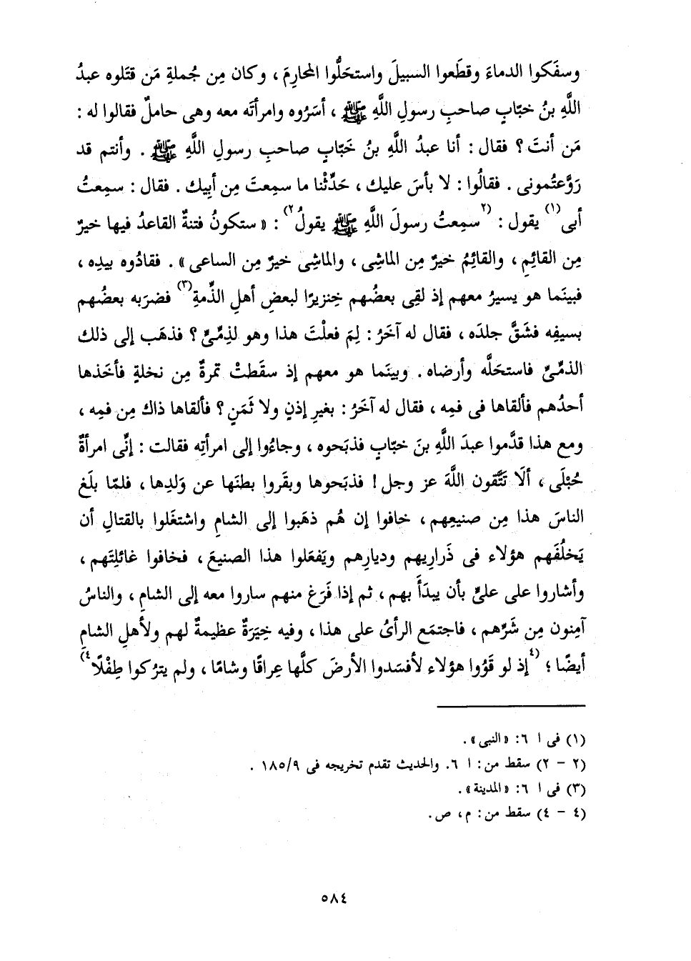 وَسَفَكُوا الدِّمَاءَ، وَقَطَعُوا السَّبِيلَ، وَاسْتَحَلُّوا الْمَحَارِمَ، وَكَانَ مِنْ جُمْلَةِ مَنْ قَتَلُوهُ عَبْدُ اللَّهِ بْنُ خَبَّابٍ صَاحِبُ رَسُولِ اللَّهِ، صَلَّى اللَّهُ عَلَيْهِ وَسَلَّمَ، أَسَرُوهُ وَامْرَأَتَهُ مَعَهُ وَهِيَ حَامِلٌ فَقَالُوا لَهُ: مَنْ أَنْتَ؟ فَقَالَ: أَنَا عَبْدُ اللَّهِ بْنُ خَبَّابٍ صَاحِبُ رَسُولِ اللَّهِ، صَلَّى اللَّهُ عَلَيْهِ وَسَلَّمَ. وَأَنْتُمْ قَدْ رَوَّعْتُمُونِي. فَقَالُوا: لَا بَأْسَ عَلَيْكَ، حَدِّثْنَا مَا سَمِعْتَ مِنْ أَبِيكَ. فَقَالَ: سَمِعْتُ أَبِي يَقُولُ: سَمِعْتُ رَسُولَ اللَّهِ، صَلَّى اللَّهُ عَلَيْهِ وَسَلَّمَ، يَقُولُ: «سَتَكُونُ فِتْنَةٌ الْقَاعِدُ فِيهَا خَيْرٌ مِنَ الْقَائِمِ، وَالْقَائِمُ خَيْرٌ مِنَ الْمَاشِي، وَالْمَاشِي خَيْرٌ مِنَ السَّاعِي،» فَقَادُوهُ بِيَدِهِ، فَبَيْنَمَا هُوَ يَسِيرُ مَعَهُمْ إِذْ لَقِيَ بَعْضُهُمْ خِنْزِيرًا لِبَعْضِ أَهْلِ الذِّمَّةِ فَضَرَبَهُ بَعْضُهُمْ بِسَيْفِهِ فَشَقَّ جِلْدَهُ، فَقَالَ لَهُ آخَرُ: لِمَ فَعَلْتَ هَذَا وَهُوَ لِذِمِّيٍّ؟ فَذَهَبَ إِلَى ذَلِكَ الذِّمِّيِّ فَاسْتَحَلَّهُ وَأَرْضَاهُ. وَبَيْنَمَا هُوَ مَعَهُمْ إِذْ سَقَطَتْ تَمْرَةٌ مِنْ نَخْلَةٍ فَأَخَذَهَا أَحَدُهُمْ فَأَلْقَاهَا فِي فَمِهِ، فَقَالَ لَهُ آخَرُ: بِغَيْرِ إِذْنٍ وَلَا ثَمَنٍ؟ فَأَلْقَاهَا ذَاكَ مِنْ فَمِهِ، وَمَعَ هَذَا قَدَّمُوا عَبْدَ اللَّهِ بْنَ خَبَّابٍ فَذَبَحُوهُ، وَجَاءُوا إِلَى امْرَأَتِهِ فَقَالَتْ: إِنِّي امْرَأَةٌ حُبْلَى أَلَا تَتَّقُونَ اللَّهَ، عَزَّ وَجَلَّ! فَذَبَحُوهَا وَبَقَرُوا بَطْنَهَا عَنْ وَلَدِهَا، فَلَمَّا بَلَغَ النَّاسَ هَذَا مِنْ صَنِيعِهِمْ، خَافُوا إِنْ هُمْ ذَهَبُوا إِلَى الشَّامِ وَاشْتَغَلُوا بِقِتَالٍ أَنْ يَخْلُفَهُمْ هَؤُلَاءِ فِي ذَرَارِيِّهِمْ وَدِيَارِهِمْ وَيَفْعَلُوا هَذَا الصَّنِيعَ، فَخَافُوا غَائِلَتَهُمْ، وَأَشَارُوا عَلَى عَلِيٍّ بِأَنْ يَبْدَأَ بِهِمْ، ثُمَّ إِذَا فَرَغَ مِنْهُمْ سَارُوا مَعَهُ إِلَى الشَّامِ، وَالنَّاسُ آمِنُونَ مِنْ شَرِّهِمْ، فَاجْتَمَعَ الرَّأْيُ عَلَى هَذَا وَفِيهِ خِيَرَةٌ عَظِيمَةٌ لَهُمْ وَلِأَهْلِ الشَّامِ أَيْضًا ; إِذْ لَوْ قَوُوا هَؤُلَاءِ لَأَفْسَدُوا الْأَرْضَ كُلَّهَا عِرَاقًا وَشَامًا، وَلَمْ يَتْرُكُوا طِفْلًا