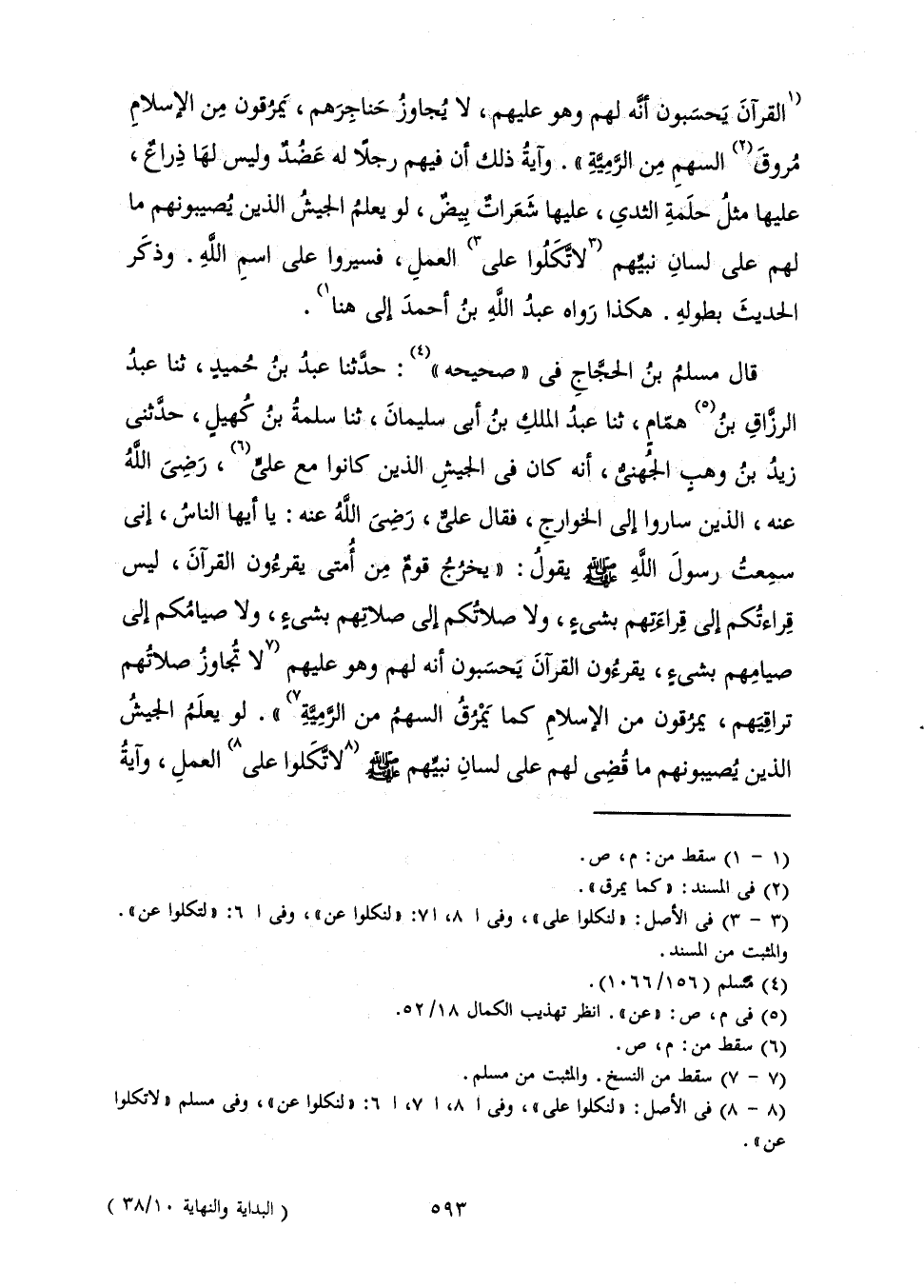 قَالَ مُسْلِمُ بْنُ الْحَجَّاجِ فِي " صَحِيحِهِ ": حَدَّثَنَا عَبْدُ بْنُ حُمَيْدٍ، ثَنَا عَبْدُ الرَّزَّاقِ بْنُ هَمَّامٍ، ثَنَا عَبْدُ الْمَلِكِ بْنُ أَبِي سُلَيْمَانَ، ثَنَا سَلَمَةُ بْنُ كُهَيْلٍ، حَدَّثَنِي زَيْدُ بْنُ وَهْبٍ الْجُهَنِيُّ، أَنَّهُ كَانَ فِي الْجَيْشِ الَّذِينَ كَانُوا مَعَ عَلِيٍّ، رَضِيَ اللَّهُ عَنْهُ، الَّذِينَ سَارُوا إِلَى الْخَوَارِجِ، فَقَالَ عَلِيٌّ، رَضِيَ اللَّهُ عَنْهُ: يَا أَيُّهَا النَّاسُ، إِنِّي سَمِعْتُ رَسُولَ اللَّهِ، صَلَّى اللَّهُ عَلَيْهِ وَسَلَّمَ، يَقُولُ: «يَخْرُجُ قَوْمٌ مِنْ أُمَّتِي يَقْرَأُونَ الْقُرْآنَ، لَيْسَ قِرَاءَتُكُمْ إِلَى قِرَاءَتِهِمْ بِشَيْءٍ، وَلَا صَلَاتُكُمْ إِلَى صَلَاتِهِمْ بِشَيْءٍ، وَلَا صِيَامُكُمْ إِلَى صِيَامِهِمْ بِشَيْءٍ، يَقْرَأُونَ الْقُرْآنَ يَحْسَبُونَ أَنَّهُ لَهُمْ وَهُوَ عَلَيْهِمْ، لَا تُجَاوِزُ صَلَاتُهُمْ تَرَاقِيَهُمْ، يَمْرُقُونَ مِنَ الْإِسْلَامِ كَمَا يَمْرُقُ السَّهْمُ مِنَ الرَّمِيَّةِ» . لَوْ يَعْلَمُ الْجَيْشُ الَّذِينَ يُصِيبُونَهُمْ مَا قُضِيَ لَهُمْ عَلَى لِسَانِ نَبِيِّهِمْ، صَلَّى اللَّهُ عَلَيْهِ وَسَلَّمَ، لَاتَّكَلُوا عَلَى الْعَمَلِ، وَآيَةُ
