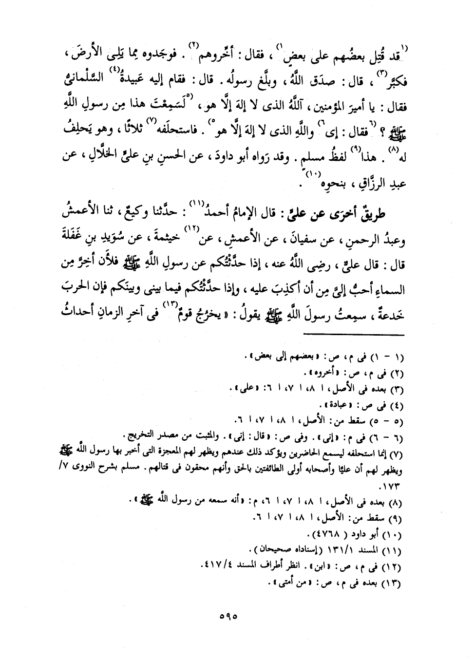 طَرِيقٌ أُخْرَى عَنْ عَلِيٍّ: قَالَ الْإِمَامُ أَحْمَدُ: حَدَّثَنَا وَكِيعٌ، ثَنَا الْأَعْمَشُ وَعَبْدُ الرَّحْمَنِ، عَنْ سُفْيَانَ، عَنِ الْأَعْمَشِ، عَنْ خَيْثَمَةَ، عَنْ سُوَيْدِ بْنِ غَفَلَةَ قَالَ: قَالَ عَلِيٌّ، رَضِيَ اللَّهُ عَنْهُ، إِذَا حَدَّثْتُكُمْ عَنْ رَسُولِ اللَّهِ، صَلَّى اللَّهُ عَلَيْهِ وَسَلَّمَ، فَلَأَنْ أَخِرَّ مِنَ السَّمَاءِ أَحَبُّ إِلَيَّ مِنْ أَنْ أَكْذِبَ عَلَيْهِ، وَإِذَا حَدَّثْتُكُمْ فِيمَا بَيْنِى وَبَيْنَكُمْ فَإِنَّ الْحَرْبَ خَدْعَةٌ، سَمِعْتُ رَسُولَ اللَّهِ، صَلَّى اللَّهُ عَلَيْهِ وَسَلَّمَ، يَقُولُ: «يَخْرُجُ قَوْمٌ فِي آخِرِ الزَّمَانِ