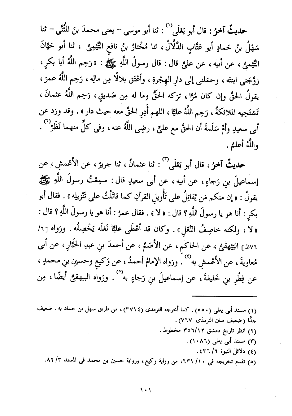 حَدِيثٌ آخَرُ: قَالَ أَبُو يَعْلَى ثَنَا أَبُو مُوسَى - يَعْنِي مُحَمَّدَ بْنَ الْمُثَنَّى - ثَنَا سَهْلُ بْنُ حَمَّادٍ أَبُو عَتَّابٍ الدَّلَّالُ، ثَنَا مُخْتَارُ بْنُ نَافِعٍ التَّيْمِيُّ، ثَنَا أَبُو حَيَّانَ التَّيْمِيُّ، عَنْ أَبِيهِ، عَنْ عَلِيٍّ قَالَ: «قَالَ رَسُولُ اللَّهِ صَلَّى اللَّهُ عَلَيْهِ وَسَلَّمَ: " رَحِمَ اللَّهُ أَبَا بَكْرٍ، زَوَّجَنِي ابْنَتَهُ، وَحَمَلَنِي إِلَى دَارِ الْهِجْرَةِ، وَأَعْتَقَ بِلَالًا مِنْ مَالِهِ، رَحِمَ اللَّهُ عُمَرَ، يَقُولُ الْحَقَّ وَإِنْ كَانَ مُرًّا، تَرَكَهُ الْحَقُّ وَمَا لَهُ مِنْ صَدِيقٍ، رَحِمَ اللَّهُ عُثْمَانَ، تَسْتَحِيهِ الْمَلَائِكَةُ، رَحِمَ اللَّهُ عَلِيًّا، اللَّهُمَّ أَدِرِ الْحَقَّ مَعَهُ حَيْثُ دَارَ» . وَقَدْ وَرَدَ عَنْ أَبِي سَعِيدٍ وَأُمِّ سَلَمَةَ أَنَّ الْحَقَّ مَعَ عَلِيٍّ، رَضِيَ اللَّهُ عَنْهُ، وَفِي كُلٍّ مِنْهُمَا نَظَرٌ. وَاللَّهُ أَعْلَمُ.