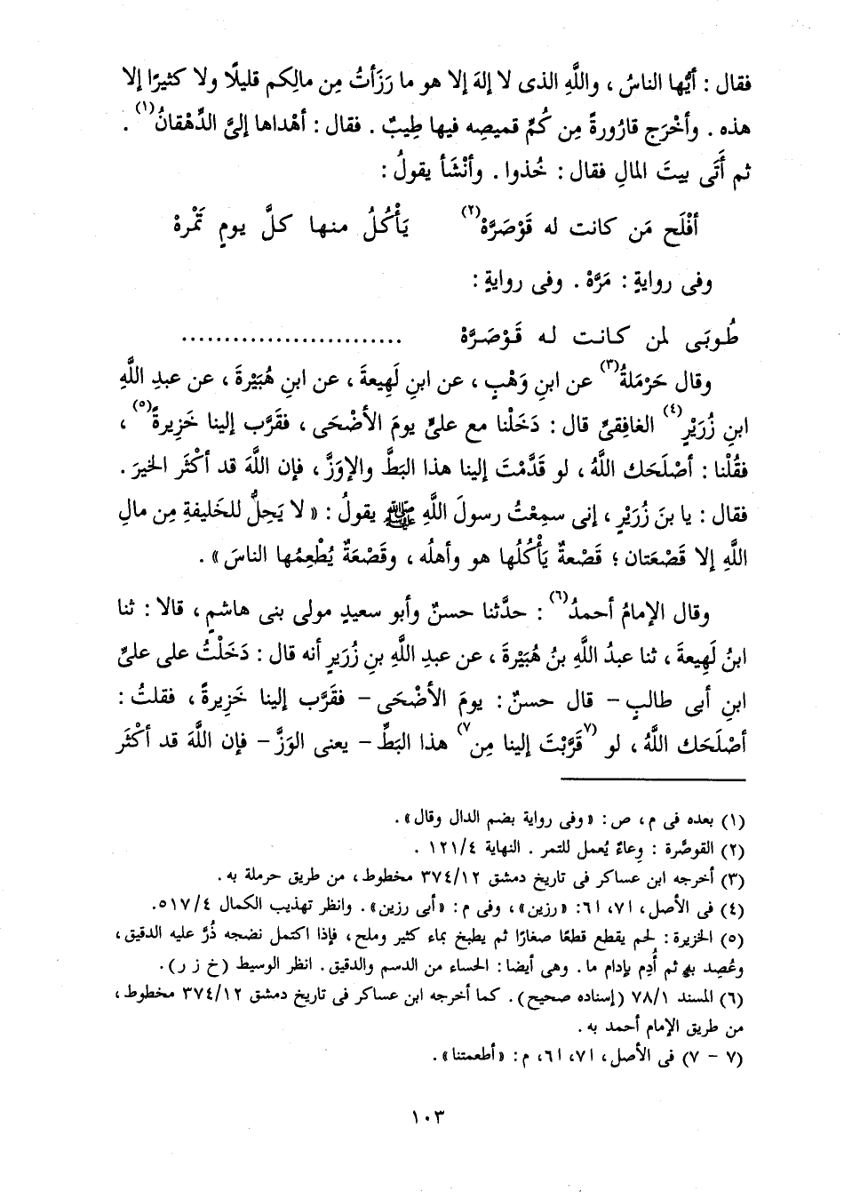 وَقَالَ الْإِمَامُ أَحْمَدُ: حَدَّثَنَا حَسَنٌ وَأَبُو سَعِيدٍ مَوْلَى بَنَى هَاشِمٍ، قَالَا: ثَنَا ابْنُ لَهِيعَةَ، ثَنَا عَبْدُ اللَّهِ بْنُ هُبَيْرَةَ، عَنْ عَبْدِ اللَّهِ بْنِ زُرَيْرٍ أَنَّهُ قَالَ دَخَلْتُ عَلَى عَلِيِّ بْنِ أَبِي طَالِبٍ - قَالَ حَسَنٌ: يَوْمَ الْأَضْحَى - فَقَرَّبَ إِلَيْنَا خَزِيرَةً، فَقُلْتُ: أَصْلَحَكَ اللَّهُ، لَوْ قَرَّبْتَ إِلَيْنَا مِنْ هَذَا الْبَطِّ - يَعْنِي الْوَزِّ - فَإِنَّ اللَّهَ قَدْ أَكْثَرَ