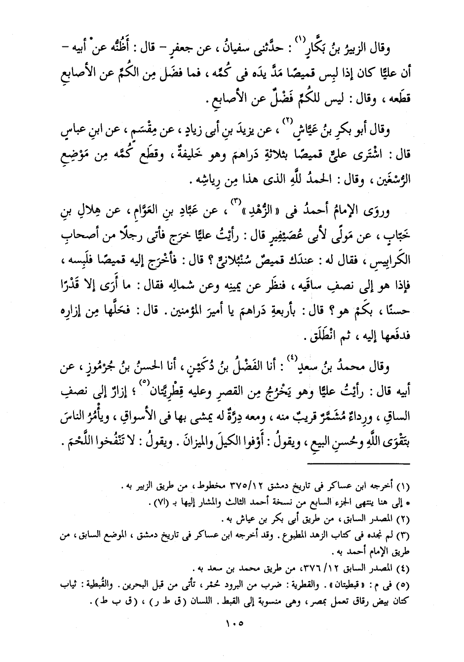 وَرَوَى الْإِمَامُ أَحْمَدُ فِي " الزُّهْدِ "، عَنْ عَبَّادِ بْنِ الْعَوَّامِ، عَنْ هِلَالِ بْنِ خَبَّابٍ، عَنْ مَوْلًى لِأَبِي عُصَيْفِيرٍ قَالَ: رَأَيْتُ عَلِيًّا خَرَجَ فَأَتَى رَجُلًا مِنْ أَصْحَابِ الْكَرَابِيسِ، فَقَالَ لَهُ: عِنْدَكَ قَمِيصٌ سُنْبُلَانِيٌّ؟ قَالَ: فَأَخْرُجُ إِلَيْهِ قَمِيصًا فَلَبِسَهُ، فَإِذَا هُوَ إِلَى نِصْفِ سَاقَيْهِ، فَنَظَرَ عَنْ يَمِينِهِ وَعَنْ شِمَالِهِ فَقَالَ: مَا أَرَى إِلَّا قَدْرًا حَسَنًا، بِكَمْ هُوَ؟ قَالَ: بِأَرْبَعَةِ دَرَاهِمَ يَا أَمِيرَ الْمُؤْمِنِينَ. قَالَ: فَحَلَّهَا مِنْ إِزَارِهِ فَدَفَعَهَا إِلَيْهِ، ثُمَّ انْطَلَقَ.