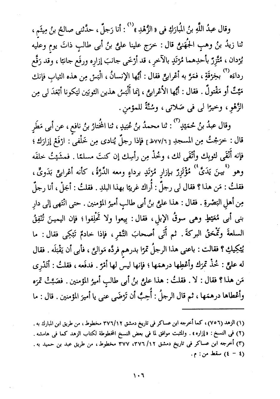وَقَالَ عَبْدُ اللَّهِ بْنُ الْمُبَارَكِ فِي " الزُّهْدِ ": أَنَا رَجُلٌ، حَدَّثَنِي صَالِحُ بْنُ مِيثَمٍ، ثَنَا زَيْدُ بْنُ وَهْبٍ الْجُهَنِيُّ قَالَ: خَرَجَ عَلَيْنَا عَلِيُّ بْنُ أَبِي طَالِبٍ ذَاتَ يَوْمٍ وَعَلَيْهِ بُرْدَانِ، مُتَّزِرٌ بِأَحَدِهِمَا مُرْتَدٍ بِالْآخَرِ، قَدْ أَرْخَى جَانِبَ إِزَارِهِ وَرَفَعَ جَانِبًا، وَقَدْ رَفَعَ رِدَاءَهُ بِخِرْقَةٍ، فَمَرَّ بِهِ أَعْرَابِيٌّ فَقَالَ: أَيُّهَا الْإِنْسَانُ، الْبَسْ مِنْ هَذِهِ الثِّيَابِ فَإِنَّكَ مَيِّتٌ أَوْ مَقْتُولٌ. فَقَالَ: أَيُّهَا الْأَعْرَابِيُّ، إِنَّمَا أَلْبَسُ هَذَيْنِ الثَّوْبَيْنِ لِيَكُونَا أَبْعَدَ لِي مِنَ الزَّهْوِ، وَخَيْرًا لِي فِي صَلَاتِي، وَسُنَّةً لِلْمُؤْمِنِ.