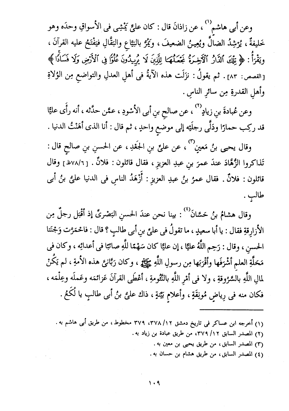 وَعَنْ أَبِي هَاشِمٍ، عَنْ زَاذَانَ قَالَ: كَانَ عَلِيٌّ يَمْشِي فِي الْأَسْوَاقِ وَحْدَهُ وَهُوَ خَلِيفَةٌ، يُرْشِدُ الضَّالَّ وَيُعِينُ الضَّعِيفَ، وَيَمُرُّ بِالْبَيَّاعِ وَالْبَقَّالِ فَيَفْتَحُ عَلَيْهِ الْقُرْآنَ، وَيَقْرَأُ {تِلْكَ الدَّارُ الْآخِرَةُ نَجْعَلُهَا لِلَّذِينَ لَا يُرِيدُونَ عُلُوًّا فِي الْأَرْضِ وَلَا فَسَادًا} [القصص: 83] . ثُمَّ يَقُولُ: نَزَلَتْ هَذِهِ الْآيَةُ فِي أَهْلِ الْعَدْلِ وَالتَّوَاضُعِ مِنَ الْوُلَاةِ وَأَهْلِ الْقُدْرَةِ مِنْ سَائِرِ النَّاسِ.