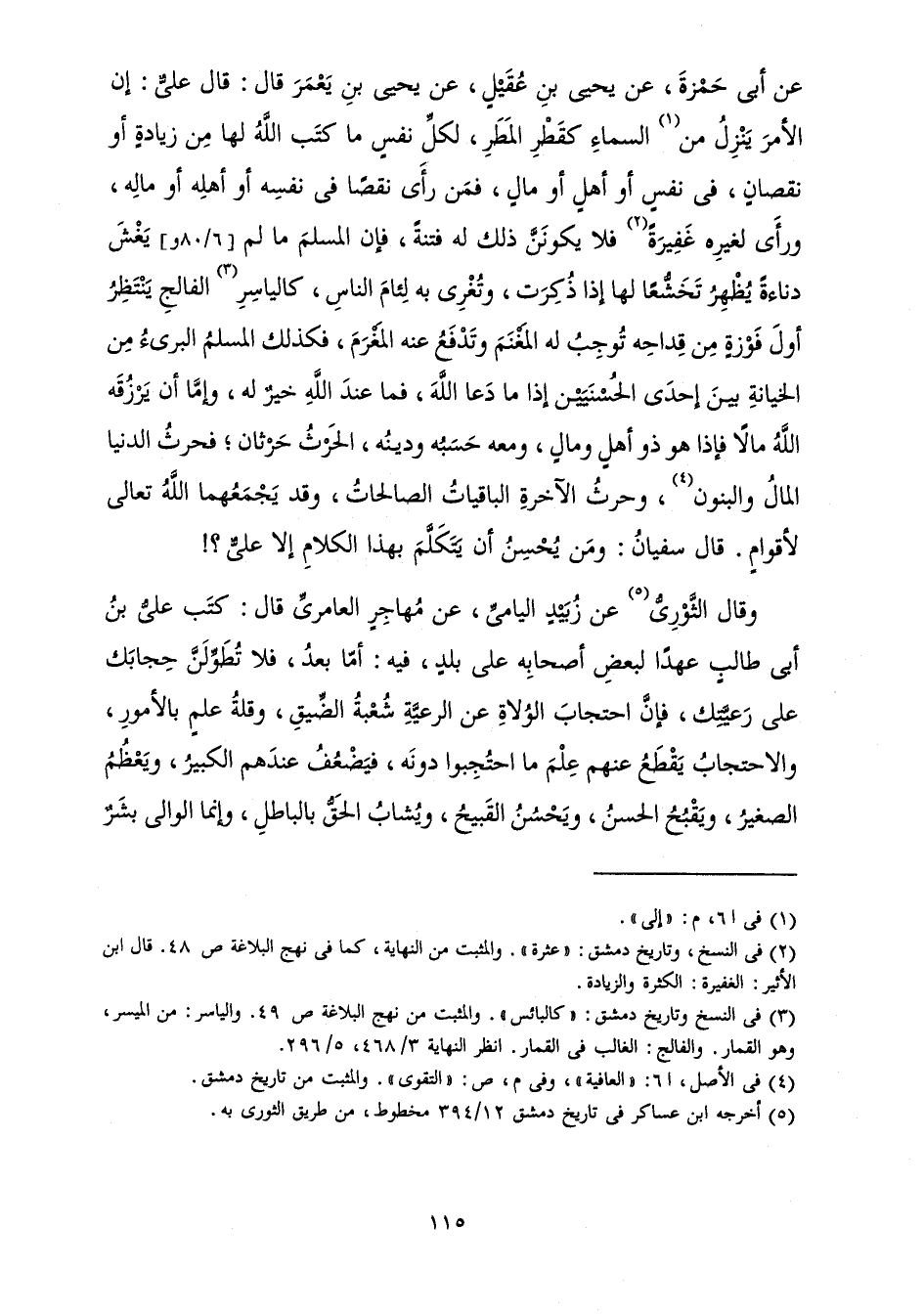 عَنْ أَبِي حَمْزَةَ، عَنْ يَحْيَى بْنِ عُقَيْلٍ، عَنْ يَحْيَى بْنِ يَعْمَرَ قَالَ: قَالَ عَلِيٌّ: إِنَّ الْأَمْرَ يَنْزِلُ مِنَ السَّمَاءِ كَقَطْرِ الْمَطَرِ، لِكُلِّ نَفْسٍ مَا كَتَبَ اللَّهُ لَهَا مِنْ زِيَادَةٍ أَوْ نُقْصَانٍ، فِي نَفْسٍ أَوْ أَهْلٍ أَوْ مَالٍ، فَمَنْ رَأَى نَقَصَا فِي نَفْسِهِ أَوْ أَهْلِهِ أَوْ مَالِهِ، وَرَأَى لِغَيْرِهِ غَفِيرَةً فَلَا يَكُونَنَّ ذَلِكَ لَهُ فِتْنَةً، فَإِنَّ الْمُسْلِمَ مَا لَمْ يَغْشَ دَنَاءَةً يُظْهِرُ تَخَشُّعًا لَهَا إِذَا ذُكِرَتْ، وَتُغْرِي بِهِ لِئَامَ النَّاسِ، كَالْيَاسِرِ الْفَالِجِ يَنْتَظِرُ أَوَّلَ فَوْزَةٍ مِنْ قِدَاحِهِ تُوجِبُ لَهُ الْمَغْنَمَ وَتَدْفَعُ عَنْهُ الْمَغْرَمَ، فَكَذَلِكَ الْمُسْلِمُ الْبَرِيءُ مِنَ الْخِيَانَةِ بَيْنَ إِحْدَى الْحُسْنَيَيْنِ إِذَا مَا دَعَا اللَّهَ، فَمَا عِنْدَ اللَّهِ خَيْرٌ لَهُ، وَإِمَّا أَنْ يَرْزُقَهُ اللَّهُ مَالًا فَإِذَا هُوَ ذُو أَهْلٍ وَمَالٍ، وَمَعَهُ حَسَبُهُ وَدِينُهُ، الْحَرْثُ حَرْثَانِ ; فَحَرْثُ الدُّنْيَا الْمَالُ وَالْبَنُونَ، وَحَرْثُ الْآخِرَةِ الْبَاقِيَاتُ الصَّالِحَاتُ، وَقَدْ يَجْمَعُهُمَا اللَّهُ تَعَالَى لِأَقْوَامٍ. قَالَ سُفْيَانُ: وَمَنْ يُحْسِنُ أَنْ يَتَكَلَّمَ بِهَذَا الْكَلَامِ إِلَّا عَلِيٌّ؟ !