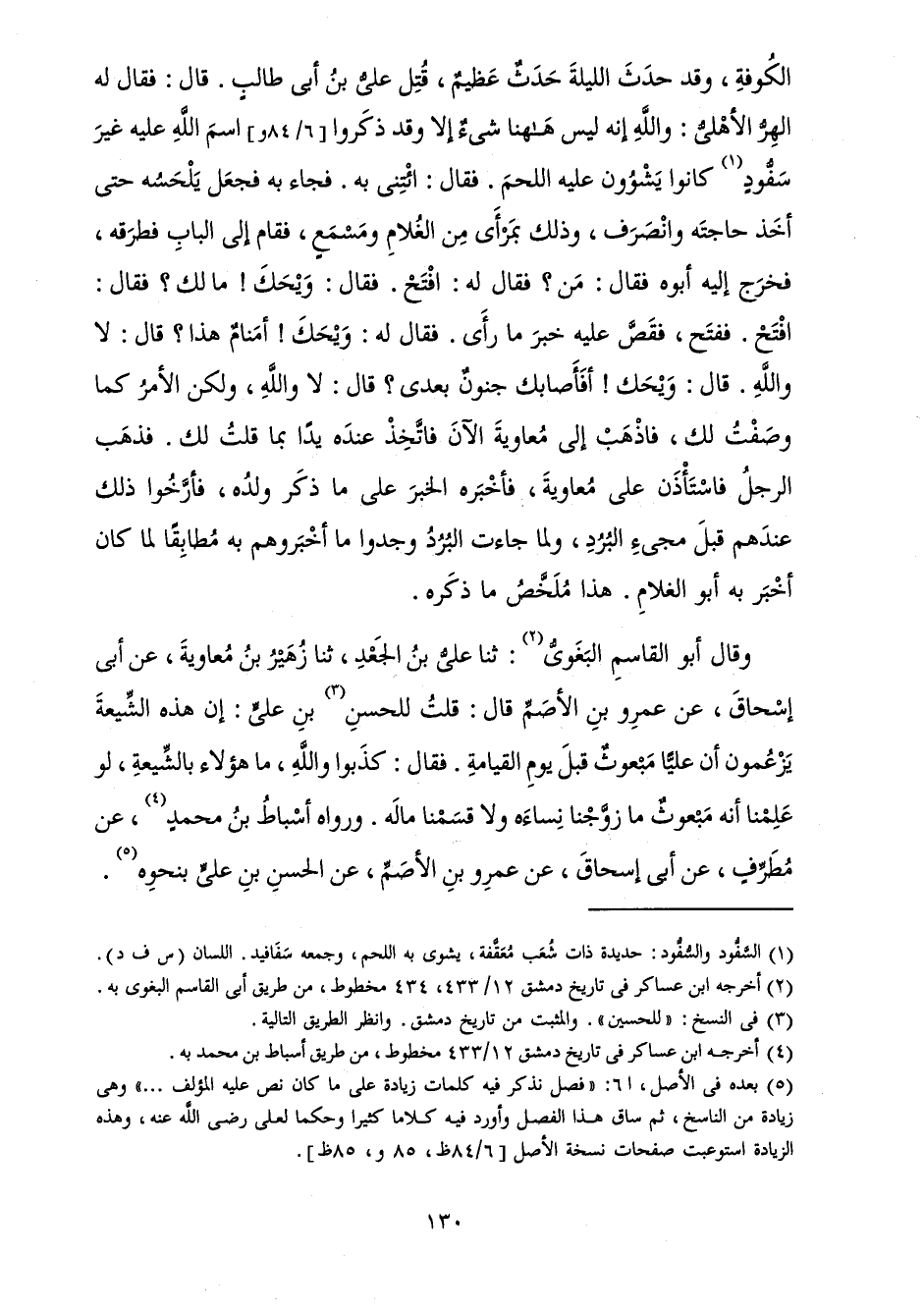 الْكُوفَةِ، وَقَدْ حَدَثَ اللَّيْلَةَ حَدَثٌ عَظِيمٌ، قُتِلَ عَلِيُّ بْنُ أَبِي طَالِبٍ. قَالَ: فَقَالَ لَهُ الْهِرُّ الْأَهْلِيُّ: وَاللَّهِ إِنَّهُ لَيْسَ هَاهُنَا شَيْءٌ إِلَّا وَقَدْ ذَكَرُوا اسْمَ اللَّهِ عَلَيْهِ غَيْرَ سَفُّودٍ كَانُوا يَشْوُونَ عَلَيْهِ اللَّحْمَ. فَقَالَ: ائْتِنِي بِهِ. فَجَاءَ بِهِ فَجَعَلَ يَلْحَسُهُ حَتَّى أَخَذَ حَاجَتَهُ وَانْصَرَفَ، وَذَلِكَ بِمَرْأَى مِنَ الْغُلَامِ وَمَسْمَعٍ، فَقَامَ إِلَى الْبَابِ فَطَرَقَهُ، فَخَرَجَ إِلَيْهِ أَبُوهُ فَقَالَ: مَنْ؟ فَقَالَ لَهُ: افْتَحْ. فَقَالَ: وَيْحَكَ! مَا لَكَ؟ فَقَالَ: افْتَحْ. فَفَتَحَ، فَقَصَّ عَلَيْهِ خَبَرَ مَا رَأَى. فَقَالَ لَهُ: وَيْحَكَ! أَمَنَامٌ هَذَا؟ قَالَ: لَا وَاللَّهِ. قَالَ: وَيْحَكَ! أَفَأَصَابَكَ جُنُونٌ بَعْدِي؟ قَالَ: لَا وَاللَّهِ، وَلَكِنَّ الْأَمْرَ كَمَا وَصَفْتُ لَكَ، فَاذْهَبْ إِلَى مُعَاوِيَةَ الْآنَ فَاتَّخِذْ عِنْدَهُ يَدًا بِمَا قُلْتُ لَكَ. فَذَهَبَ الرَّجُلُ فَاسْتَأْذَنَ عَلَى مُعَاوِيَةَ، فَأَخْبَرُهُ الْخَبَرَ عَلَى مَا ذَكَرَ وَلَدُهُ، فَأَرَّخُوا ذَلِكَ عِنْدَهُمْ قَبْلَ مَجِيءِ الْبُرُدِ، وَلَمَّا جَاءَتِ الْبُرُدُ وَجَدُوا مَا أَخْبَرُوهُمْ بِهِ مُطَابِقًا لِمَا كَانَ أَخْبَرَ بِهِ أَبُو الْغُلَامِ. هَذَا مُلَخَّصُ مَا ذَكَرَهُ.
