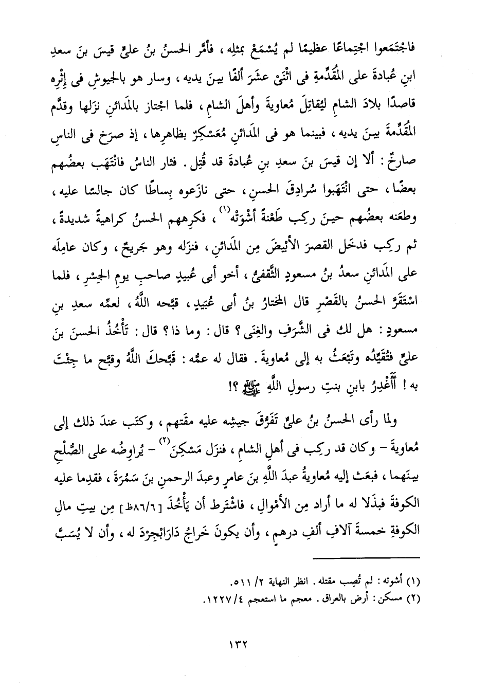 فَاجْتَمَعُوا اجْتِمَاعًا عَظِيمًا لَمْ يُسْمَعْ بِمِثْلِهِ، فَأَمَرَ الْحَسَنُ بْنُ عَلِيٍّ قَيْسَ بْنَ سَعْدِ بْنِ عُبَادَةَ عَلَى الْمُقَدِّمَةِ فِي اثْنَيْ عَشَرَ أَلْفًا بَيْنَ يَدَيْهِ، وَسَارَ هُوَ بِالْجُيُوشِ فِي إِثْرِهِ قَاصِدًا بِلَادَ الشَّامِ لِيُقَاتِلَ مُعَاوِيَةَ وَأَهْلَ الشَّامِ فَلَمَّا اجْتَازَ بِالْمَدَائِنِ نَزَلَهَا وَقَدَّمَ الْمُقَدِّمَةَ بَيْنَ يَدَيْهِ، فَبَيْنَمَا هُوَ فِي الْمَدَائِنِ مُعَسْكِرٌ بِظَاهِرِهَا، إِذْ صَرَخَ فِي النَّاسِ صَارِخٌ: أَلَا إِنَّ قَيْسَ بْنَ سَعْدِ بْنِ عُبَادَةَ قَدْ قُتِلَ. فَثَارَ النَّاسُ فَانْتَهَبَ بَعْضُهُمْ بَعْضًا، حَتَّى انْتَهَبُوا سُرَادِقَ الْحَسَنِ. حَتَّى نَازَعُوهُ بِسَاطًا كَانَ جَالِسًا عَلَيْهِ، وَطَعَنَهُ بَعْضُهُمْ حِينَ رَكِبَ طَعْنَةً أَشْوَتْهُ، فَكَرِهَهُمُ الْحَسَنُ كَرَاهِيَةً شَدِيدَةً، ثُمَّ رَكِبَ فَدَخَلَ الْقَصْرَ الْأَبْيَضَ مِنَ الْمَدَائِنِ فَنَزَلَهُ وَهُوَ جَرِيحٌ، وَكَانَ عَامِلَهُ عَلَى الْمَدَائِنِ سَعْدُ بْنُ مَسْعُودٍ الثَّقَفِيُّ، أَخُو أَبِي عُبَيْدٍ صَاحِبِ يَوْمِ الْجِسْرِ، فَلَمَّا اسْتَقَرَّ الْحَسَنُ بِالْقَصْرِ قَالَ الْمُخْتَارُ بْنُ أَبَى عُبَيْدٍ، قَبَّحَهُ اللَّهُ، لِعَمِّهِ سَعْدِ بْنِ مَسْعُودٍ: هَلْ لَكَ فِي الشَّرَفِ وَالْغِنَى؟ قَالَ: وَمَاذَا؟ قَالَ: تَأْخُذُ الْحَسَنَ بْنَ عَلِيٍّ فَتُقَيِّدُهُ وَتَبْعَثُ بِهِ إِلَى مُعَاوِيَةَ. فَقَالَ لَهُ عَمُّهُ: قَبَّحَكَ اللَّهُ وَقَبَّحَ مَا جِئْتَ بِهِ! أَأَغْدِرُ بِابْنِ بِنْتِ رَسُولِ اللَّهِ صَلَّى اللَّهُ عَلَيْهِ وَسَلَّمَ؟ !