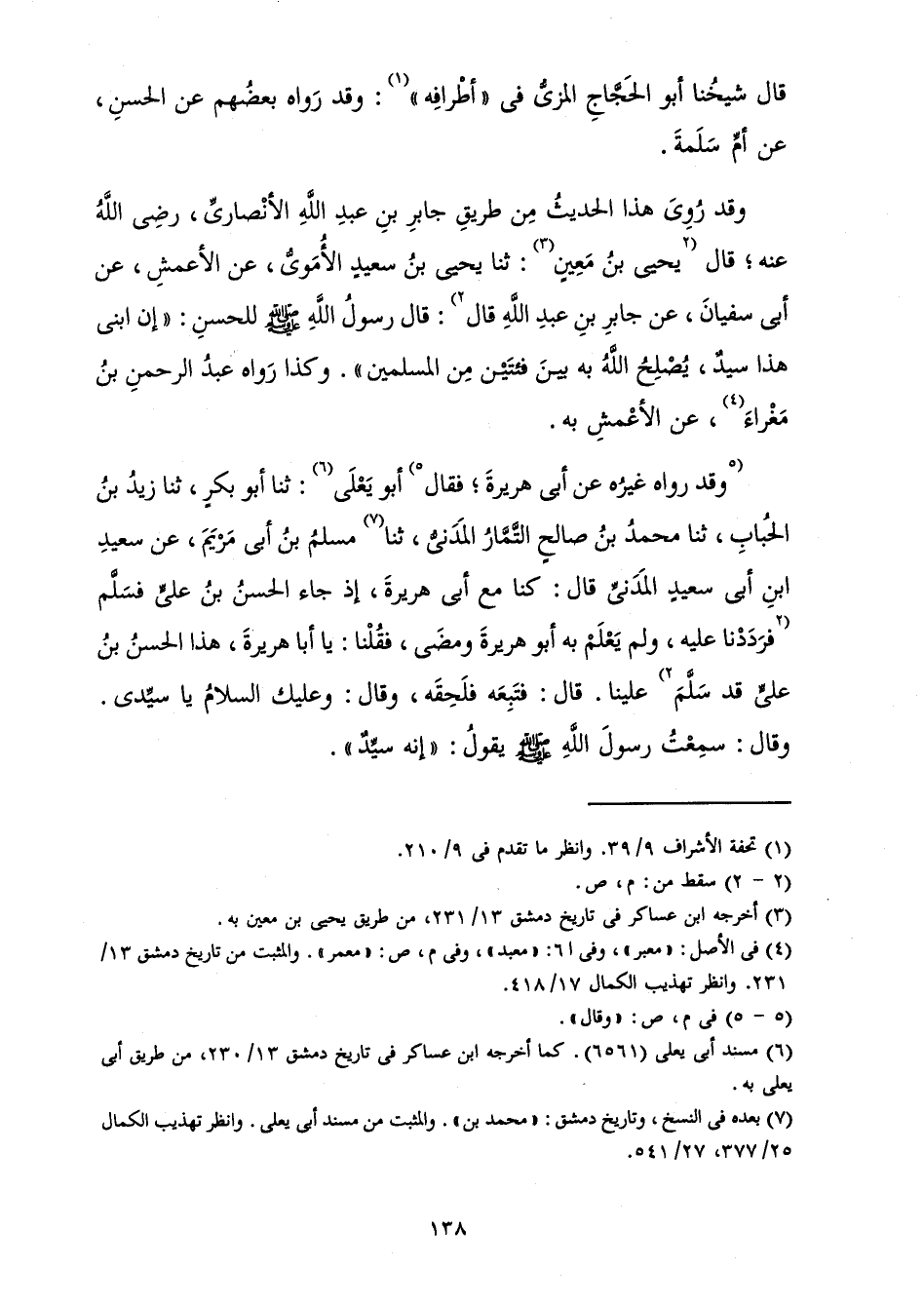 وَقَدْ رَوَاهُ غَيْرُهُ عَنْ أَبِي هُرَيْرَةَ ; فَقَالَ أَبُو يَعْلَى: ثَنَا أَبُو بَكْرٍ، ثَنَا زَيْدُ بْنُ الْحُبَابِ، ثَنَا مُحَمَّدُ بْنُ صَالِحٍ التَّمَّارُ الْمَدَنِيُّ، ثَنَا مُسْلِمُ بْنُ أَبِي مَرْيَمَ، عَنْ سَعِيدِ بْنِ أَبِي سَعِيدٍ الْمَدَنِيِّ قَالَ: كُنَّا مَعَ أَبِي هُرَيْرَةَ، إِذْ جَاءَ الْحَسَنُ بْنُ عَلِيٍّ فَسَلَّمَ فَرَدَدْنَا عَلَيْهِ، وَلَمْ يَعْلَمْ بِهِ أَبُو هُرَيْرَةَ وَمَضَى، فَقُلْنَا: يَا أَبَا هُرَيْرَةَ، هَذَا الْحَسَنُ بْنُ عَلِيٍّ قَدْ سَلَّمَ عَلَيْنَا. قَالَ: فَتَبِعَهُ فَلَحِقَهُ، وَقَالَ: وَعَلَيْكَ السَّلَامُ يَا سَيِّدِي. وَقَالَ: «سَمِعْتُ رَسُولَ اللَّهِ صَلَّى اللَّهُ عَلَيْهِ وَسَلَّمَ يَقُولُ " إِنَّهُ سَيِّدٌ» ".