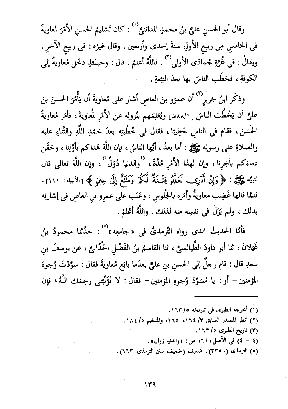 فَأَمَّا الْحَدِيثُ الَّذِي رَوَاهُ التِّرْمِذِيُّ فِي " جَامِعِهِ ": حَدَّثَنَا مَحْمُودُ بْنُ غَيْلَانَ، ثَنَا أَبُو دَاوُدَ الطَّيَالِسِيُّ، ثَنَا الْقَاسِمُ بْنُ الْفَضْلِ الْحُدَّانِيُّ، عَنْ يُوسُفَ بْنِ سَعْدٍ قَالَ: قَامَ رَجُلٌ إِلَى الْحَسَنِ بْنِ عَلِيٍّ بَعْدَ مَا بَايَعَ مُعَاوِيَةَ فَقَالَ: سَوَّدْتَ وُجُوهَ الْمُؤْمِنِينَ - أَوْ: يَا مُسَوِّدَ وُجُوهِ الْمُؤْمِنِينَ - فَقَالَ: لَا تُؤَنِّبْنِي رَحِمَكَ اللَّهُ ; فَإِنَّ