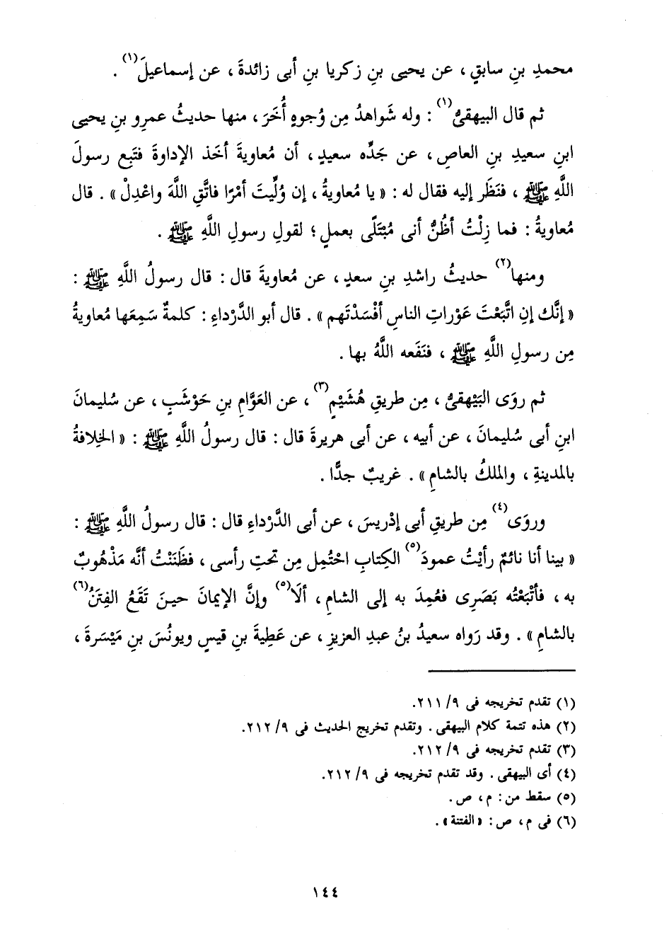 وَرَوَى مِنْ طَرِيقِ أَبِي إِدْرِيسَ، عَنْ أَبَى الدَّرْدَاءِ قَالَ: قَالَ رَسُولُ اللَّهِ صَلَّى اللَّهُ عَلَيْهِ وَسَلَّمَ: «بَيْنَا أَنَا نَائِمٌ رَأَيْتُ عَمُودَ الْكُتَّابِ احْتُمِلَ مِنْ تَحْتِ رَأْسِي، فَظَنَنْتُ أَنَّهُ مَذْهُوبٌ بِهِ، فَأَتْبَعْتُهُ بِصَرِي فَعُمِدَ بِهِ إِلَى الشَّامِ أَلَا وَإِنَّ الْإِيمَانَ حِينَ تَقَعُ الْفِتَنُ بِالشَّامِ» ". وَقَدْ رَوَاهُ سَعِيدُ بْنُ عَبْدِ الْعَزِيزِ، عَنْ عَطِيَّةَ بْنِ قَيْسٍ وَيُونُسَ بْنِ مَيْسَرَةَ،