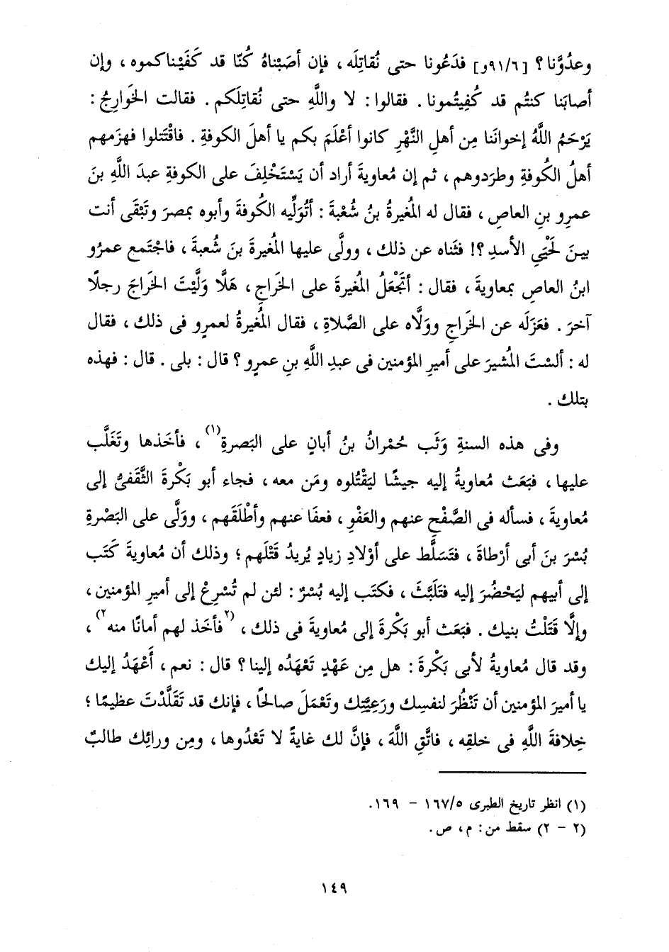 وَعَدُوَّنَا؟ فَدَعَوْنَا حَتَّى نُقَاتِلَهُ، فَإِنْ أَصَبْنَاهُ كُنَّا قَدْ كَفَيْنَاكُمُوهُ، وَإِنْ أَصَابَنَا كُنْتُمْ قَدْ كَفَيْتُمُونَا. فَقَالُوا: لَا وَاللَّهِ حَتَّى نُقَاتِلَكُمْ. فَقَالَتِ الْخَوَارِجُ: يَرْحَمُ اللَّهُ إِخْوَانَنَا مِنْ أَهْلِ النَّهْرِ كَانُوا أَعْلَمَ بِكُمْ يَا أَهْلِ الْكُوفَةِ. فَاقْتَتَلُوا فَهَزَمَهُمْ أَهْلُ الْكُوفَةِ وَطَرَدُوهُمْ، ثُمَّ إِنَّ مُعَاوِيَةَ أَرَادَ أَنْ يَسْتَخْلِفَ عَلَى الْكُوفَةِ عَبْدَ اللَّهِ بْنَ عَمْرِو بْنِ الْعَاصِ، فَقَالَ لَهُ الْمُغِيرَةُ بْنُ شُعْبَةَ: أَتُوَلِّيهِ الْكُوفَةَ وَأَبُوهُ بِمِصْرَ وَتَبْقَى أَنْتَ بَيْنَ لَحْيَيِ الْأَسَدِ؟ ! فَثَنَاهُ عَنْ ذَلِكَ، وَوَلَّى عَلَيْهَا الْمُغِيرَةَ بْنَ شُعْبَةَ، فَاجْتَمَعَ عَمْرُو بْنُ الْعَاصِ بِمُعَاوِيَةَ، فَقَالَ: أَتَجْعَلُ الْمُغِيرَةَ عَلَى الْخَرَاجِ، هَلَّا وَلَّيْتَ الْخَرَاجَ رَجُلًا آخَرَ. فَعَزَلَهُ عَنِ الْخَرَاجِ وَوَلَّاهُ عَلَى الصَّلَاةِ، فَقَالَ الْمُغِيرَةُ لِعَمْرٍو فِي ذَلِكَ، فَقَالَ لَهُ: أَلَسْتَ الْمُشِيرَ عَلَى أَمِيرِ الْمُؤْمِنِينَ فِي عَبْدِ اللَّهِ بْنِ عَمْرٍو؟ قَالَ: بَلَى. قَالَ: فَهَذِهِ بِتِلْكَ.