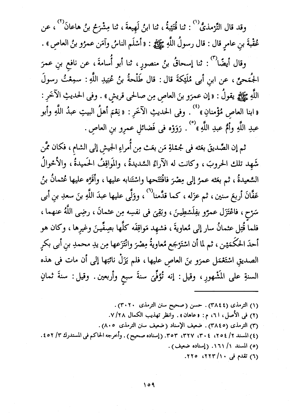 وَقَالَ أَيْضًا: ثَنَا إِسْحَاقُ بْنُ مَنْصُورٍ، ثَنَا أَبُو أُسَامَةَ، عَنْ نَافِعِ بْنِ عُمَرَ الْجُمَحِيِّ، عَنِ ابْنِ أَبِي مُلَيْكَةَ قَالَ: قَالَ طَلْحَةُ بْنُ عُبَيْدِ اللَّهِ سَمِعْتُ رَسُولَ اللَّهِ صَلَّى اللَّهُ عَلَيْهِ وَسَلَّمَ يَقُولُ: «إِنَّ عَمْرَو بْنَ الْعَاصِ مِنْ صَالِحِي قُرَيْشٍ ".» وَفِي الْحَدِيثِ الْآخَرِ «ابْنَا الْعَاصِ مُؤْمِنَانِ» وَفِي الْحَدِيثِ الْآخَرِ «نِعْمَ أَهْلُ الْبَيْتِ عَبْدُ اللَّهِ وَأَبُو عَبْدِ اللَّهِ وَأُمُّ عَبْدِ اللَّهِ» رَوَوْهُ فِي فَضَائِلِ عَمْرِو بْنِ الْعَاصِ